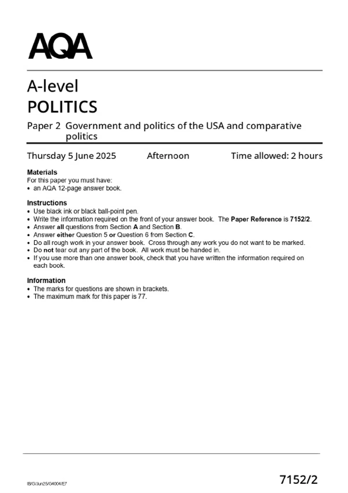 2025 AQA A-LEVEL Politics 7152/2 Paper 2 - Comparative Politics: Government and Politics of the USA MERGED QUESTION PAPER & MARKSCHEME