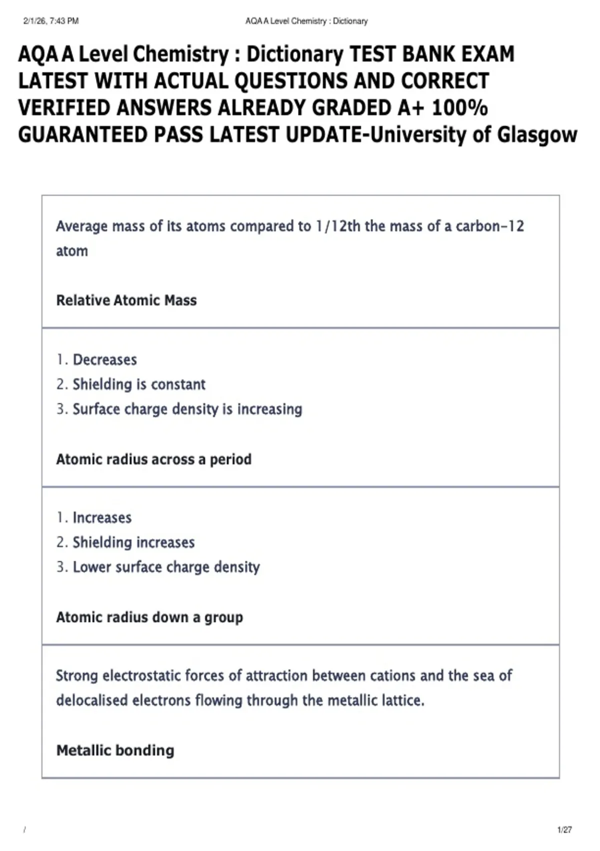 AQA A Level Chemistry : Dictionary TEST BANK EXAM LATEST WITH ACTUAL QUESTIONS AND CORRECT VERIFIED ANSWERS ALREADY GRADED A+ 100% GUARANTEED PASS LATEST UPDATE-University of Glasgow