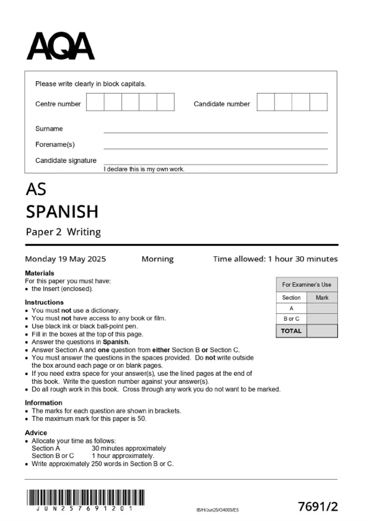 2025 AQA AS Spanish 7691/2 Paper 2 Writing MERGED QUESTION PAPER & MARKSCHEME