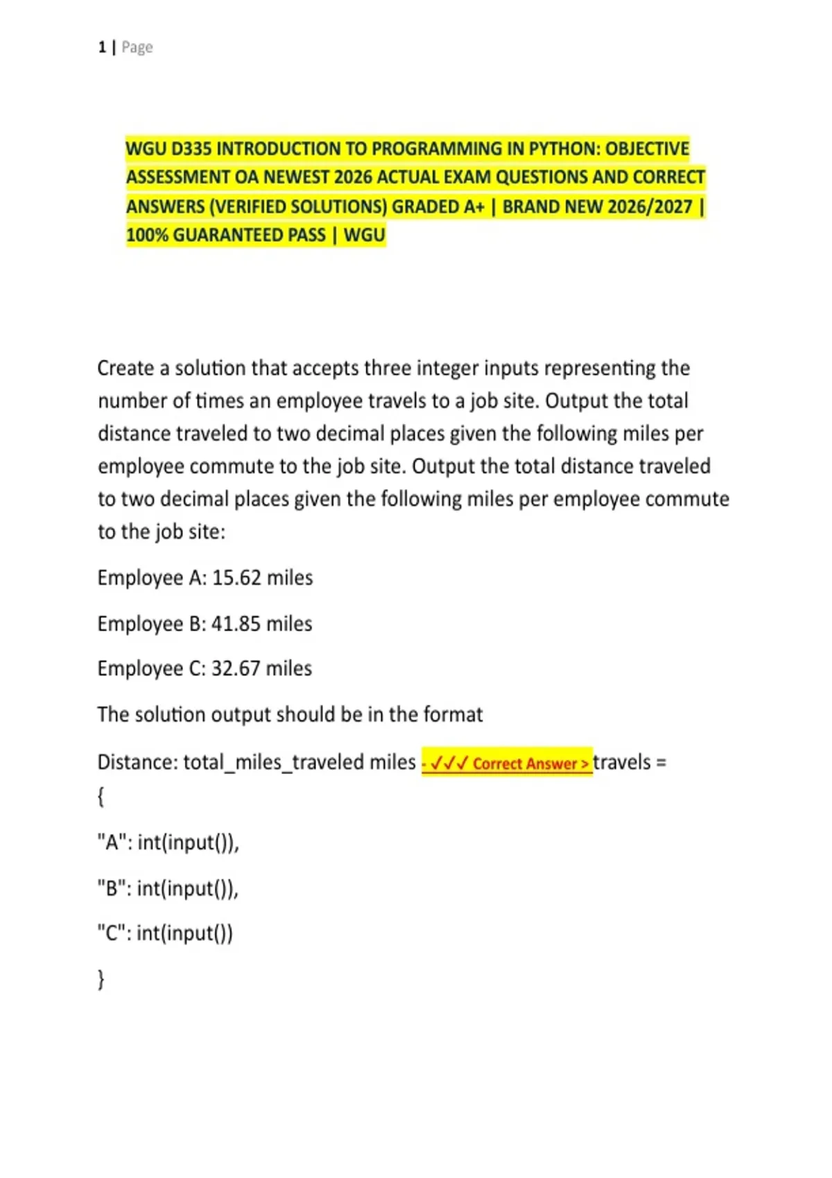 WGU D335 INTRODUCTION TO PROGRAMMING IN PYTHON: OBJECTIVE ASSESSMENT OA NEWEST 2026 ACTUAL EXAM QUESTIONS AND CORRECT ANSWERS (VERIFIED SOLUTIONS) GRADED A+ | BRAND NEW 2026/2027 | 100% GUARANTEED PASS | WGU Create a solution that accepts three integer inputs representing the number of times an employee travels to a job site. Output the total distance traveled to two decimal places given the following miles per employee commute to the job site. Output the total distance traveled to two decimal places given the following miles per employee commute to the job site: Employee A: 15.62 miles Employee B: 41.85 miles Employee C: 32.67 miles The solution output should be in the format Distance: total_miles_traveled miles - Correct Answer travels = { "A": int(input()), "B": int(input()), "C": int(input()) } 2 | Page miles_per_employee = {"A": 15.62, "B":41.85, "C": 32.67} total_miles_traveled = sum(travels[employee] * miles_per_employee[employee] for employee in travels) print(f"Distance: {total_miles_traveled:.2f} miles") Create a solution that accepts an integer input representing any number of ounces. Output the converted total number of tons, pounds, and remaining ounces based on the input ounces value. There are 16 ounces in a pound and 2,000 pounds in a ton. The solution output should be in the format Tons: value_1 Pounds: value_2 Ounces: value_3 - Correct Answer ounces = int(input()) value_1 = ounces // (16 * 2000) value_2 = (ounces % (16 * 2000)) // 16 value_3 = ounces % 16 print(f"Tons: {value_1}") print(f"Pounds: {value_2}") print(f"Ounces: {value_3}") Create a solution that accepts any three integer inputs representing the base (b1, b2) and height (h) measurements of a trapezoid in meters. Output the exact area of the trapezoid in square meters as a float value. The exact area of a trapezoid can be calculated by finding the average of the two base measurements, then multiplying by the height measurement. Trapezoid Area Formula:A = [(b1 + b2) / 2] * h The solution output should be in the format 3 | Page Trapezoid area: area_value square meters - Correct Answer b1 = int(input()) b2