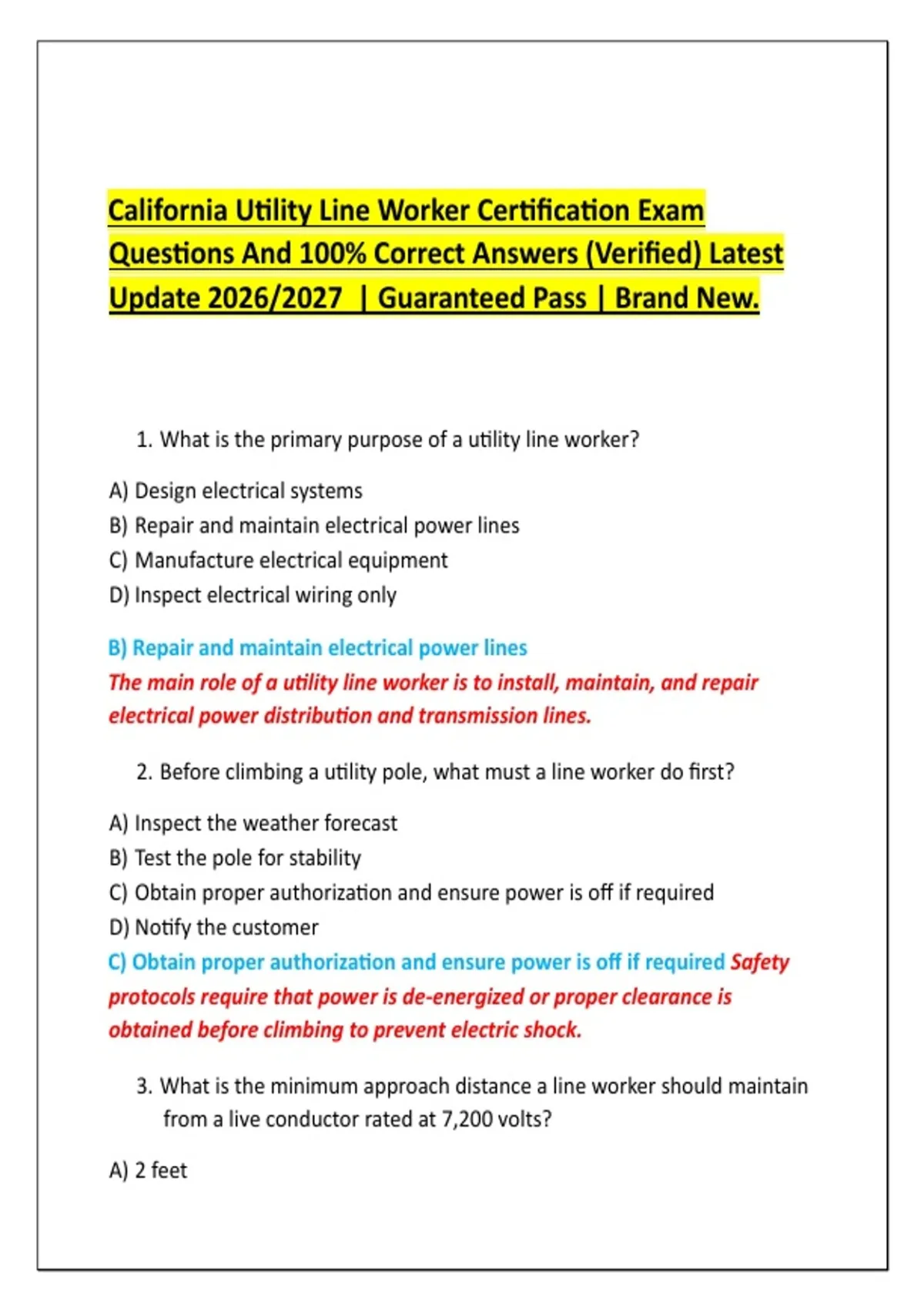 California Utility Line Worker Certification Exam Questions And 100% Correct Answers (Verified) Latest Update 2026/2027 | Guaranteed Pass | Brand New.