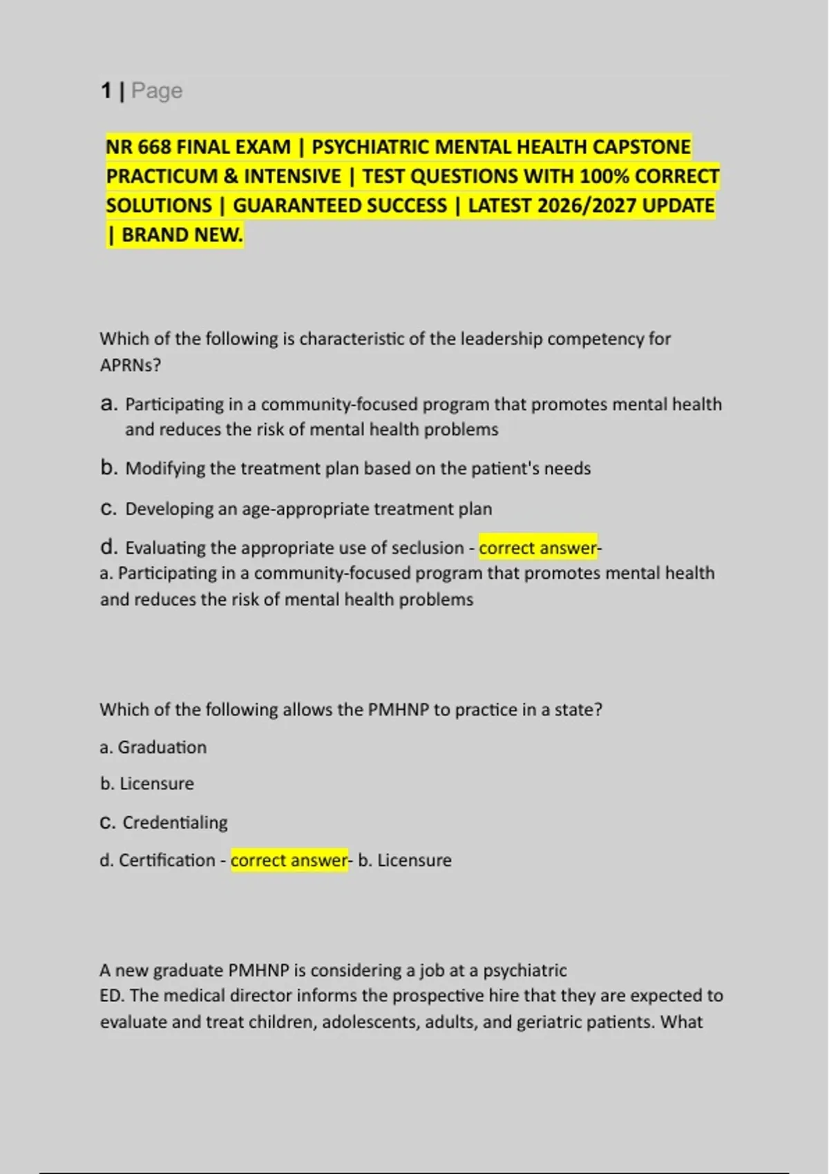 NR 668 FINAL EXAM | PSYCHIATRIC MENTAL HEALTH CAPSTONE PRACTICUM & INTENSIVE | TEST QUESTIONS WITH 100% CORRECT SOLUTIONS | GUARANTEED SUCCESS | LATEST 2026/2027 UPDATE | BRAND NEW.
