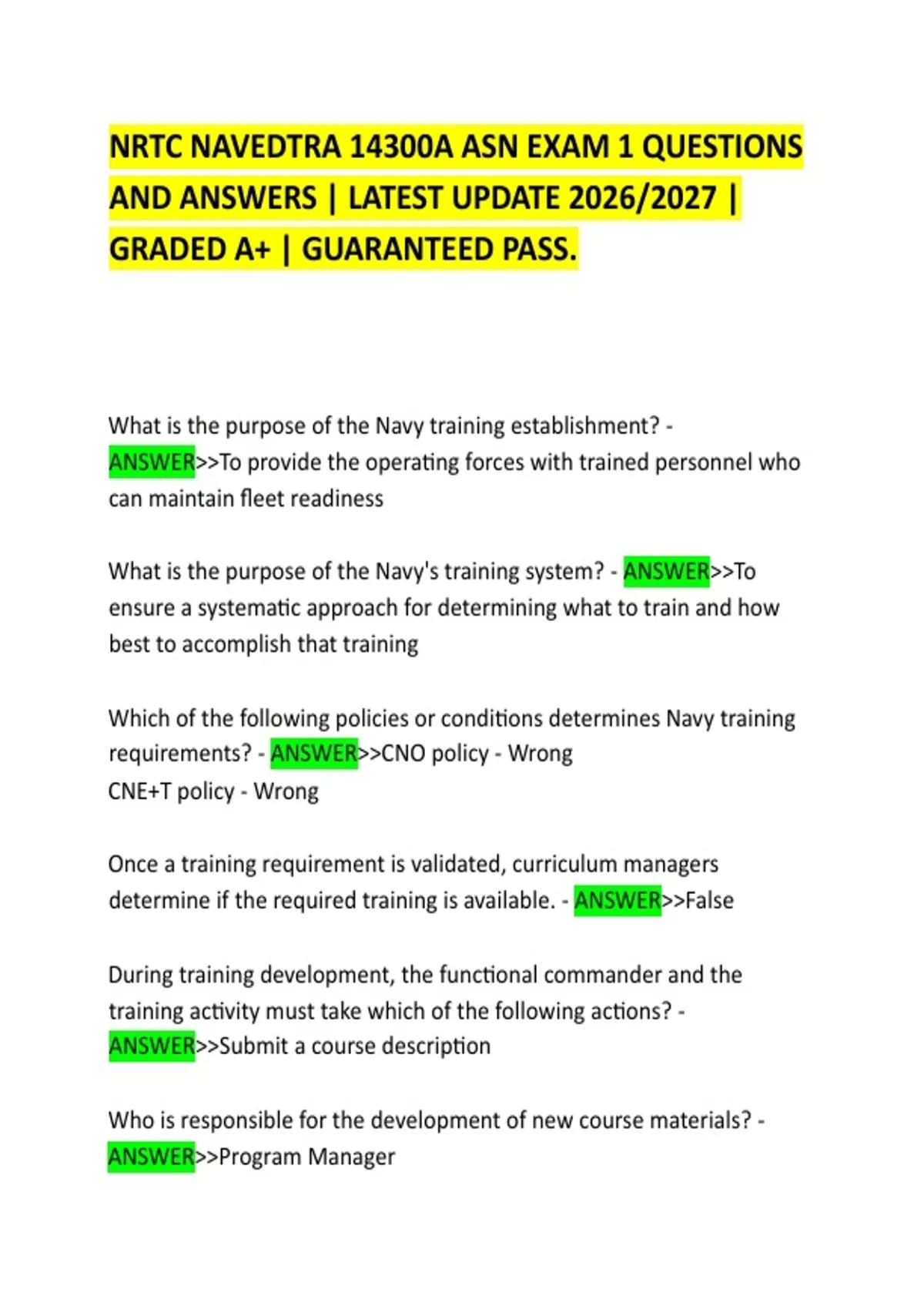 NRTC NAVEDTRA 14300A ASN EXAM 1 QUESTIONS AND ANSWERS | LATEST UPDATE 2026/2027 | GRADED A+ | GUARANTEED PASS. What is the purpose of the Navy training establishment? - ANSWER>>To provide the operating forces with trained personnel who can maintain fleet readiness What is the purpose of the Navy's training system? - ANSWER>>To ensure a systematic approach for determining what to train and how best to accomplish that training Which of the following policies or conditions determines Navy training requirements? - ANSWER>>CNO policy - Wrong CNE+T policy - Wrong Once a training requirement is validated, curriculum managers determine if the required training is available. - ANSWER>>False During training development, the functional commander and the training activity must take which of the following actions? - ANSWER>>Submit a course description Who is responsible for the development of new course materials? - ANSWER>>Program Manager What is the goal of the systems approach? - ANSWER>>To establish uniform training The responsibility of instructors of Navy training courses is to develop curriculum. - ANSWER>>False Two-thirds of all people in the Navy are involved in some kind of training at any one time. - ANSWER>>False