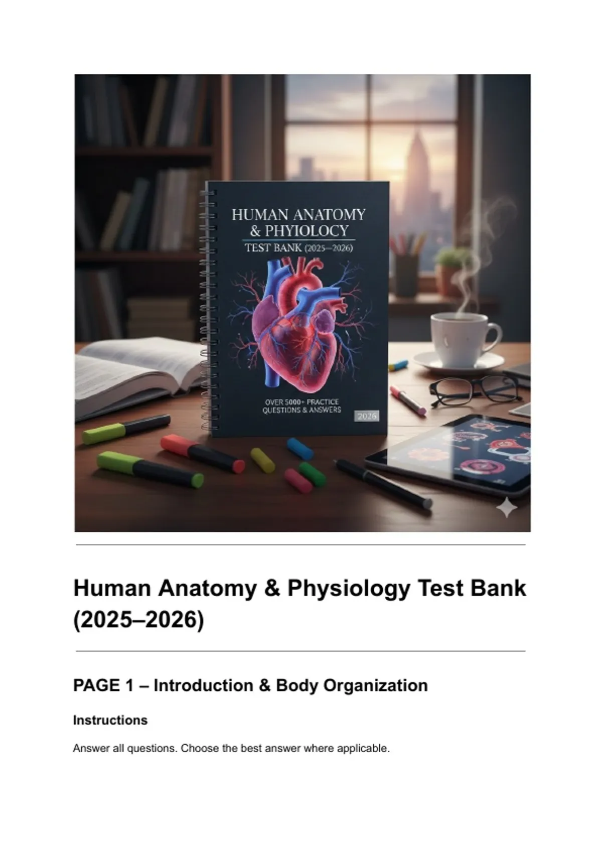 This document is a comprehensive Human Anatomy & Physiology Test Bank (2025–2026) containing carefully prepared exam questions and fully correct answers. It is designed to help students revise key anatomy and physiology concepts, test their understanding, and prepare effectively for examinations. The questions cover major body systems and essential topics commonly assessed in Human Anatomy & Physiology courses. This test bank is ideal for exam preparation, self-assessment, and practice, and is suitable for university and college students studying Anatomy & Physiology.