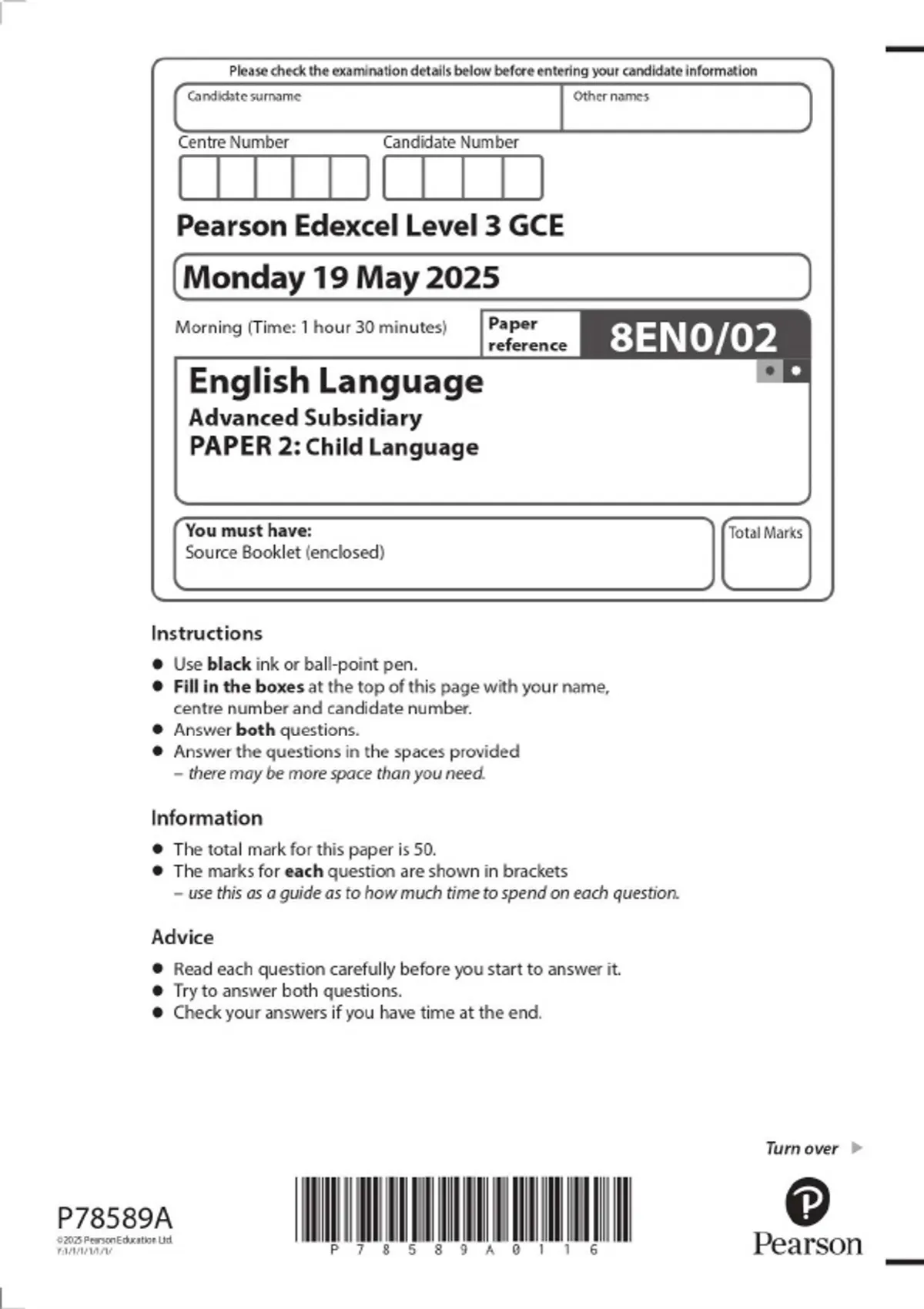 Pearson Edexcellevel 3 GCE MAY 2025 ENGLISH LANGUAGE PAPER 2 CHILD LANGUAGE