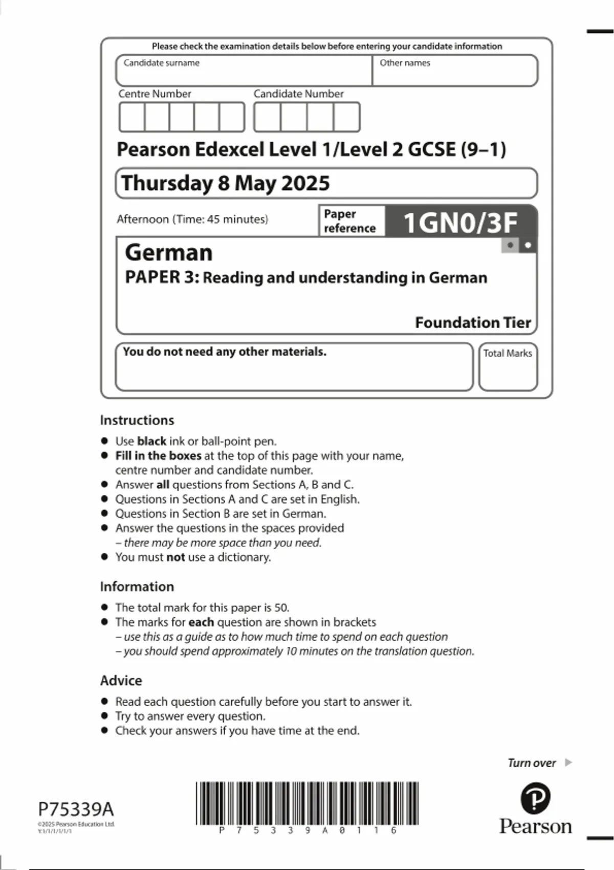 2025 Pearson Edexcel GCSE German PAPER 3 QUESTION PAPER 1GN0/3F: Reading and understanding in German