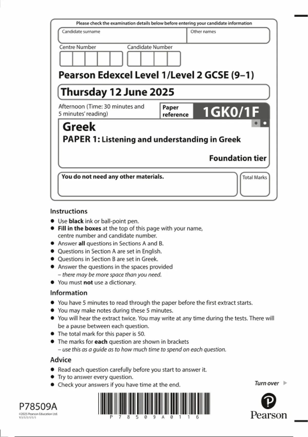 2025 Pearson Edexcel GCSE Greek PAPER 1 QUESTION PAPER 1GK0/1F: Listening and understanding in Greek