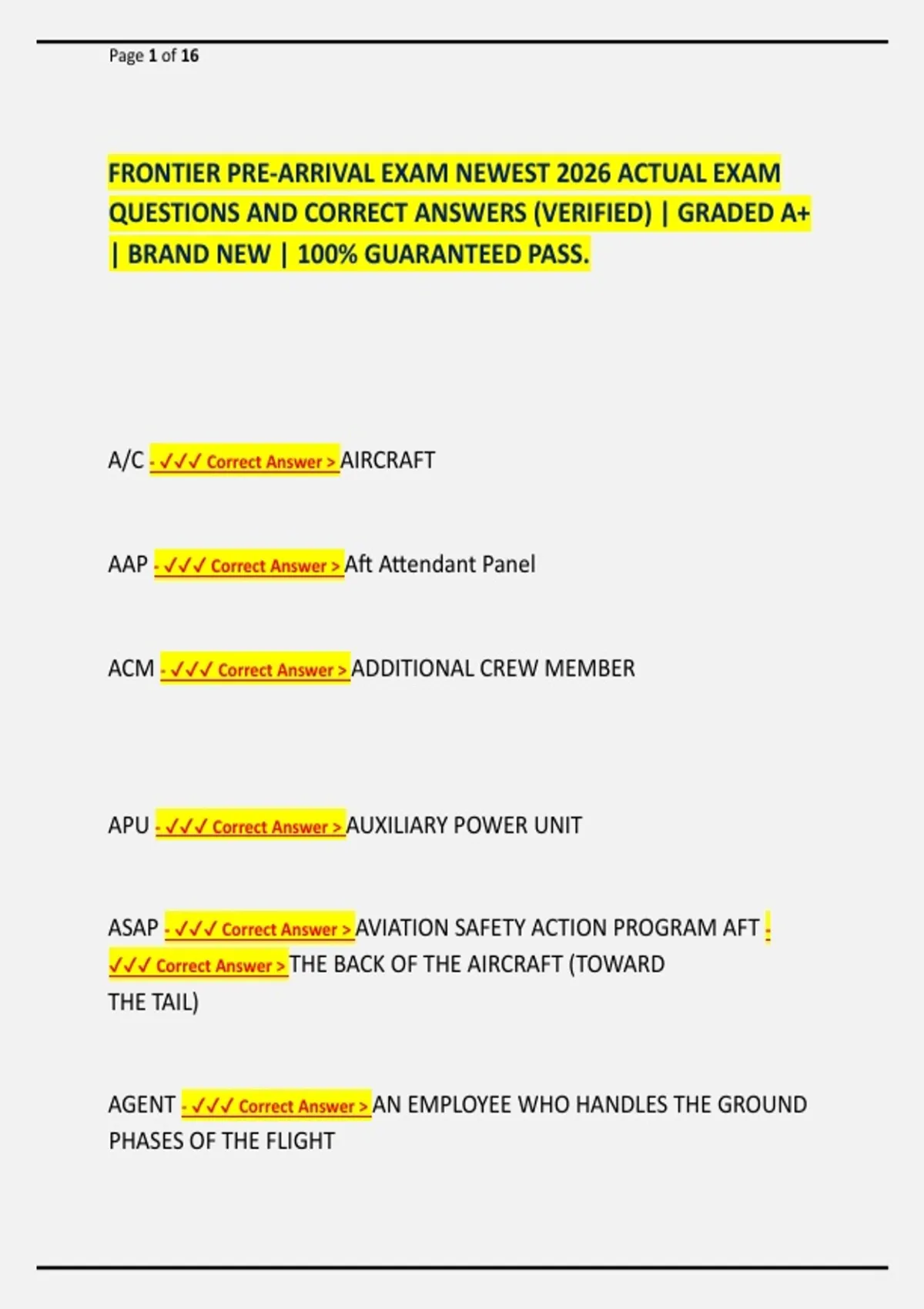 FRONTIER PRE-ARRIVAL EXAM NEWEST 2026 ACTUAL EXAM