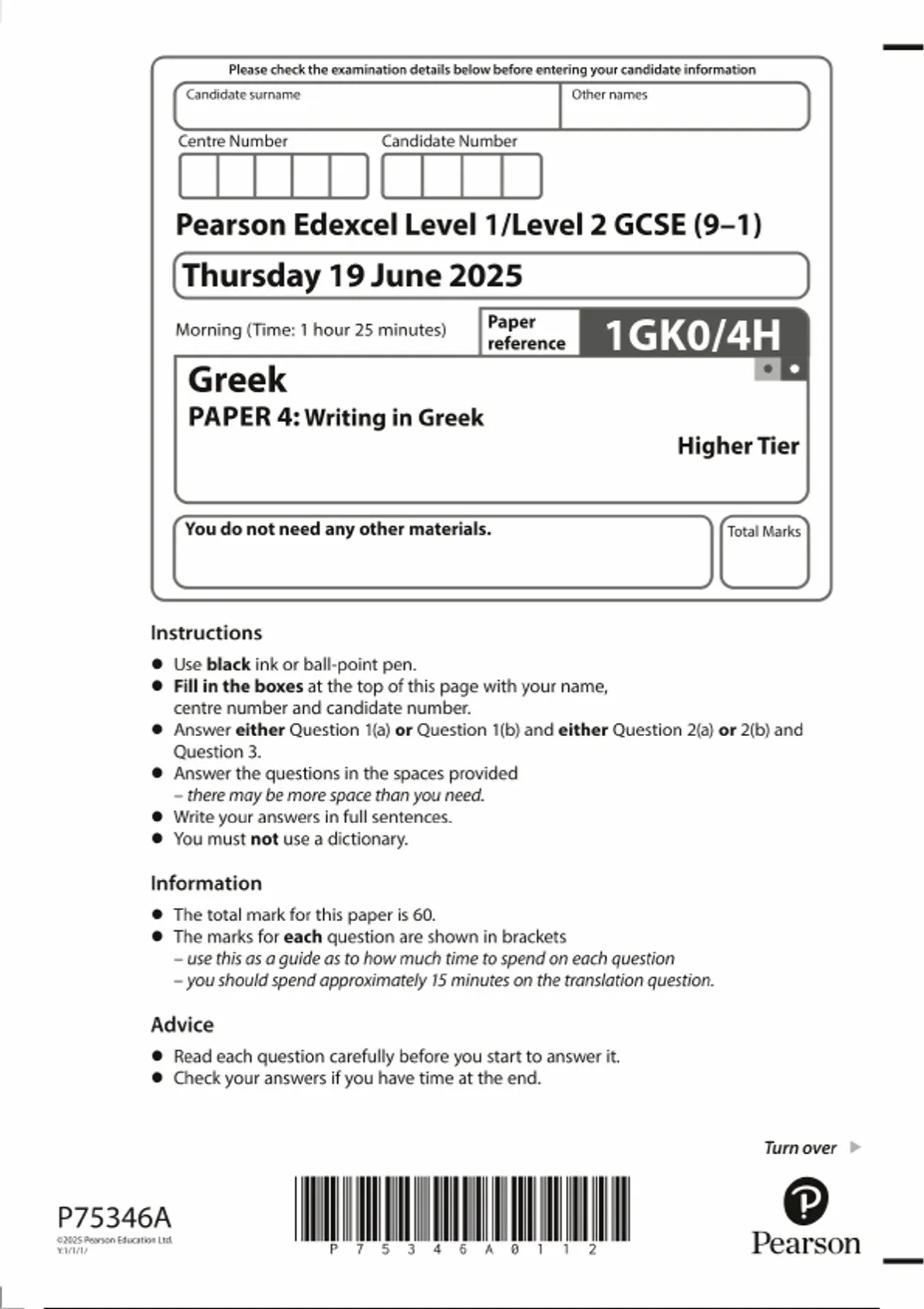 2025 Pearson Edexcel GCSE Greek PAPER 4 QUESTION PAPER 1GK0/4H : Writing in Greek Higher Tier