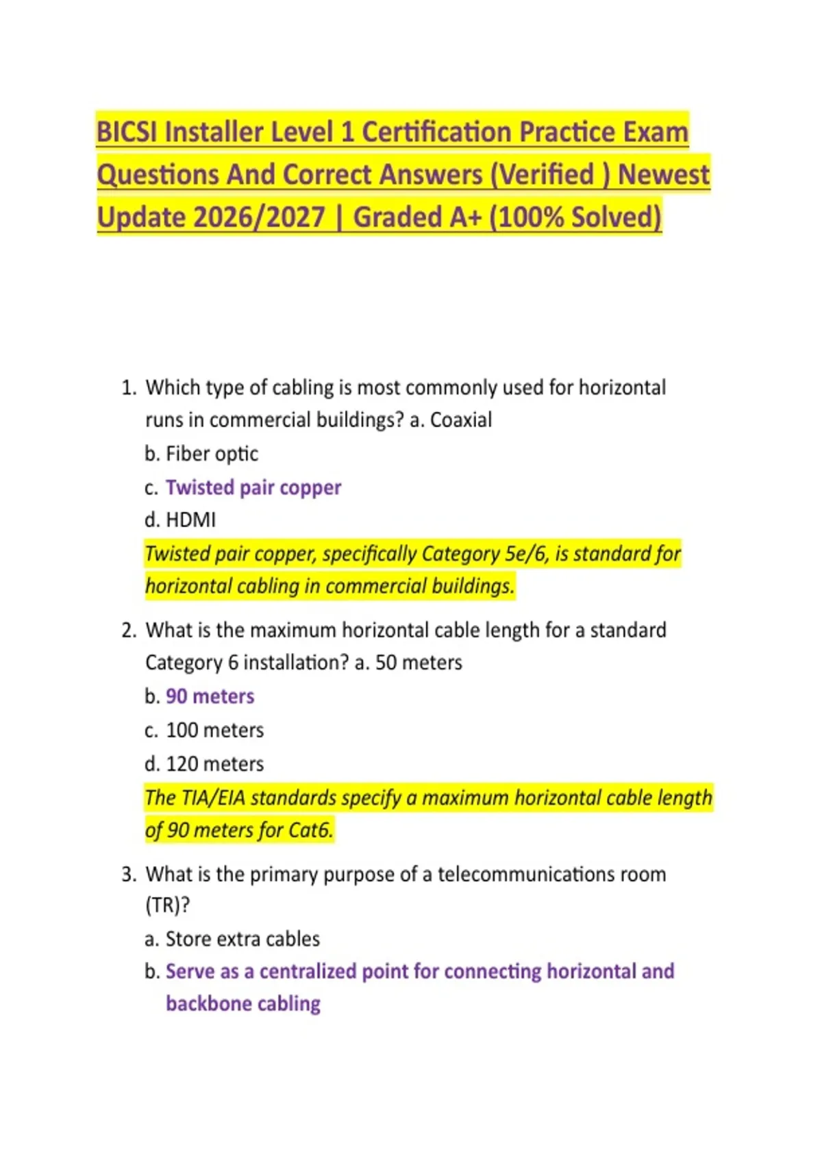 BICSI Installer Level 1 Certification Practice Exam Questions And Correct Answers (Verified ) Newest Update 2026/2027 | Graded A+ (100% Solved) 1. Which type of cabling is most commonly used for horizontal runs in commercial buildings? a. Coaxial b. Fiber optic c. Twisted pair copper d. HDMI Twisted pair copper, specifically Category 5e/6, is standard for horizontal cabling in commercial buildings. 2. What is the maximum horizontal cable length for a standard Category 6 installation? a. 50 meters b. 90 meters c. 100 meters d. 120 meters The TIA/EIA standards specify a maximum horizontal cable length of 90 meters for Cat6. 3. What is the primary purpose of a telecommunications room (TR)? a. Store extra cables b. Serve as a centralized point for connecting horizontal and backbone cabling c. Provide a workspace for technicians d. House electrical panels Telecommunications rooms are used to connect backbone and horizontal cabling for distribution. 5. What is the minimum bend radius for Category 6 cable? a. 2x cable diameter b. 4x cable diameter c. 8x cable diameter d. 10x cable diameter To prevent performance degradation, TIA/EIA standards require an 8x cable diameter minimum bend radius. 6. Which type of fire rating is required for riser cables between floors? a. Plenum b. Riser c. General purpose d. Industrial Riser-rated cables are designed for vertical runs between floors and prevent flame propagation. 7. What is the primary advantage of fiber optic cable over copper cabling? a. Easier termination b. Lower cost c. Higher bandwidth and longer distances d. Flexibility Fiber optic supports higher bandwidth and longer runs without signal degradation compared to copper. 8. Which tool is used to verify cable continuity? a. Punch-down tool b. Crimping tool c. Cable tester d. Wire stripper Cable testers check for continuity, opens, shorts, and miswires. 4. Which of the following is a common color for a telecommunications grounding bus bar (TGB)? a. Blue b. Red c. Yellow d. Green Green is the standard color for grounding conductors and bus bars in structured cabling. 9. What is the typical connector used for Category 6 twistedpair cable terminations? a. BNC b. LC c. RJ-45 d. SC RJ-45 modular connectors are standard for Cat5e/Cat6 terminations. 10. How often should horizontal cabling be supported in a ceiling or wall? a. Every 1 foot b. Every 2 feet c. Every 4.5 feet d. Every 6 feet TIA/EIA standards require horizontal cabling to be supported at intervals no greater than 4.5 feet. 11. What is the purpose of a patch panel? a. Store cables b. Terminate fiber only c. Provide an organized point to interconnect incoming and outgoing cables d. Power network devices A patch panel allows structured termination and reconfiguration of network connections.