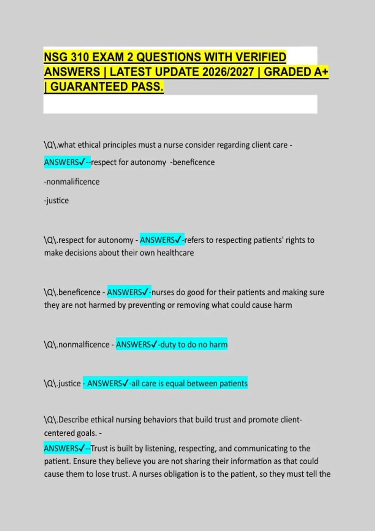 NSG 310 EXAM 2 QUESTIONS WITH VERIFIED ANSWERS | LATEST UPDATE 2026/2027 | GRADED A+ | GUARANTEED PASS. what ethical principles must a nurse consider regarding client care - ANSWERS--respect for autonomy -beneficence -nonmalificence -justice Q.respect for autonomy - ANSWERS-refers to respecting patients' rights to make decisions about their own healthcare Q.beneficence - ANSWERS-nurses do good for their patients and making sure they are not harmed by preventing or removing what could cause harm Q.nonmalficence - ANSWERS-duty to do no harm Q.justice - ANSWERS-all care is equal between patients Q.Describe ethical nursing behaviors that build trust and promote clientcentered goals. - ANSWERS--Trust is built by listening, respecting, and communicating to the patient. Ensure they believe you are not sharing their information as that could cause them to lose trust. A nurses obligation is to the patient, so they must tell the patient the truth and use words that can instill a mutual respect between the patient and nurse. -veracity -fidelity Q.key elements of management of care, include - ANSWERS--advanced directives -advocacy -client rights -HIPAA -confidentiality -informed consent Q.advanced directive - ANSWERS-express how the patient wants medical treatment in the instance they are unable to verbalize their desires themselves Q.advocacy - ANSWERS-Nurses are the patient's advocate and must use this right to stand up for the patient if their needs are not being met, if their autonomy is not being respected, if their information has been shared without their permission (includes to family), and if patient is not receiving complete information about procedures/therapies. Q.client rights - ANSWERS-The client has the right to direct their care. They can accept or deny any care they want. Q.HIPAA (Health Insurance Portability and Accountability Act) - ANSWERS- disclosing pt information. protects individuals from losing health insurance when leaving or changing jobs Q.confidentiality - ANSWERS-duty of health care providers to protect the secrecy of the patient's information Q.veracity - ANSWERS-obligation to tell the truth and not lie to or deceive others Q.fidelity - ANSWERS-obligation to other or to the organization (ANA Code of Ethics: to client, to self, to colleagues, to nursing profession); faithfulness Q.informed consent - ANSWERS--correlated to autonomy the client must receive all information about proposed treatment. They can therefore make a decision to refuse or accept based on all information. -This was affirmed at the federal level with the Client Self-Determination Act of 1991 -EMERGENCY EXCEPTION: when informed consent cannot be given due to emergent situations -THERAPEUTIC PRIVILEGE: when informing the patient could make the situation worse than better. Q.client self determination act - ANSWERS-the right for the patient to have informed consent or refusal. can't hold back info Q.if a patient is receiving care for something you are uncomfortable with what do you do - ANSWERS-reflect on your own self values and morals Q.Articulate the nurse's ethical and legal responsibility to maintain the confidentiality of client information and records. - ANSWERS-The nurse needs to maintain patient privacy because they could have to pay a hefty fine or go to prison. Not only that but it creates an environment where the patient can not trust healthcare and an uncertainty in the patient that all of their private information is out in the hands of people they do not know. The patient may also have significant reasons for not wanting many people to know their history or that they are even in the hospital. We would want to protect them at all costs. Q.private law - ANSWERS-between individuals (contract law and tort law) Q.contract law - ANSWERS-nurses work under contract; promissory agreement between 2 or more parties that creates legal relationship (written/verbal or implied) Q.enforceable contract - ANSWERS-a valid contract that can be enforced because there are no legal defenses against it Q.tort - ANSWERS-private or civil wrong for which the law grants a remedy Q.unintentional tort - ANSWERS-incur harm or injury because of unintended, wrongful act (negligence, malpractice, assault, battery, false imprisonment, lack of informed consent, breach of confidentiality)