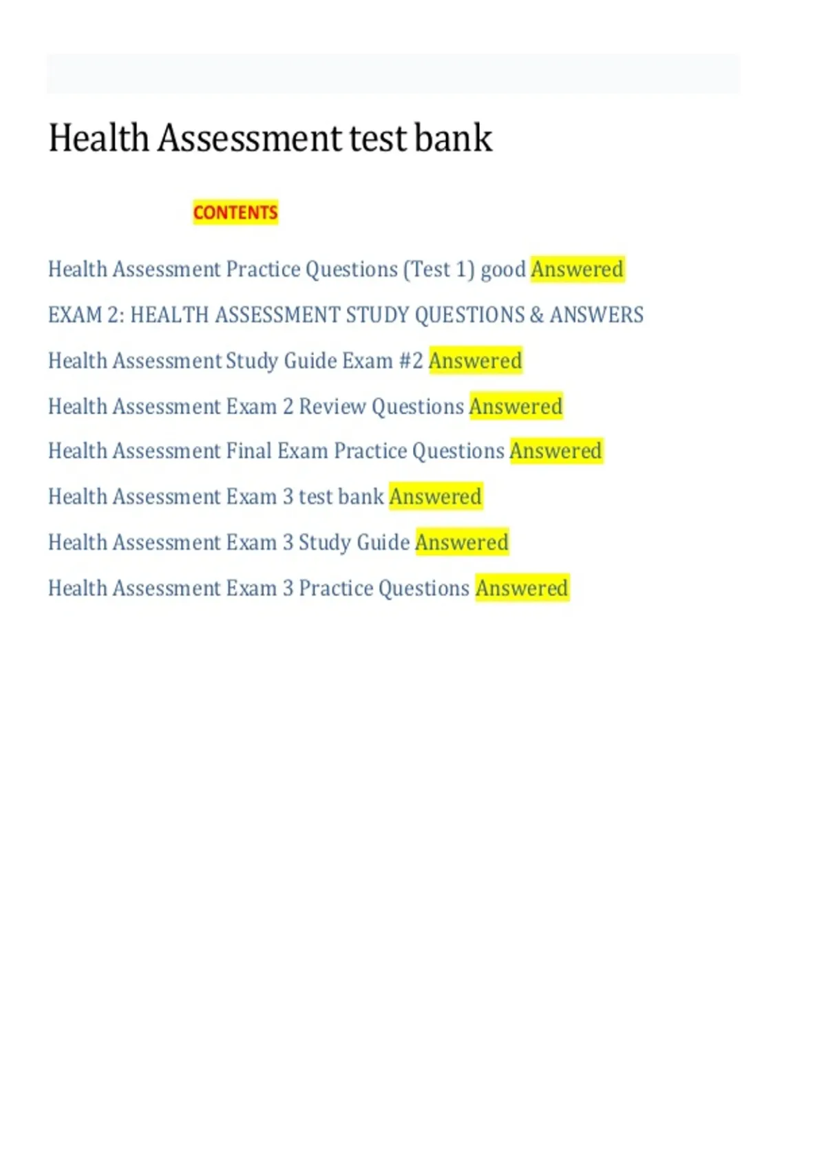 Access the complete Health Assessment Test Bank, featuring verified answers, detailed solutions, and practice questions for effective 2026 nursing exam preparation and assessment study success.