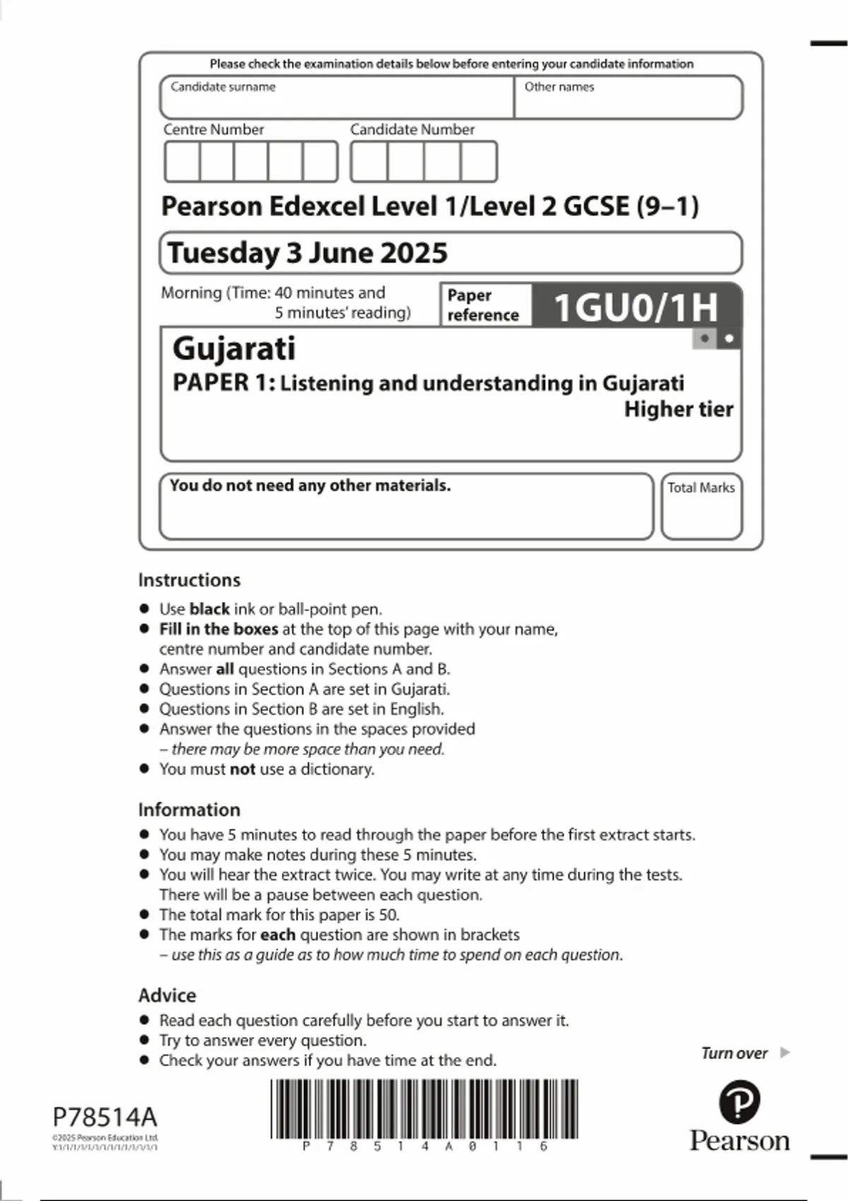 2025 Pearson Edexcel GCSE Gujarati PAPER 1 QUESTION PAPER 1GU0/1H : Listening and understanding in Gujarati