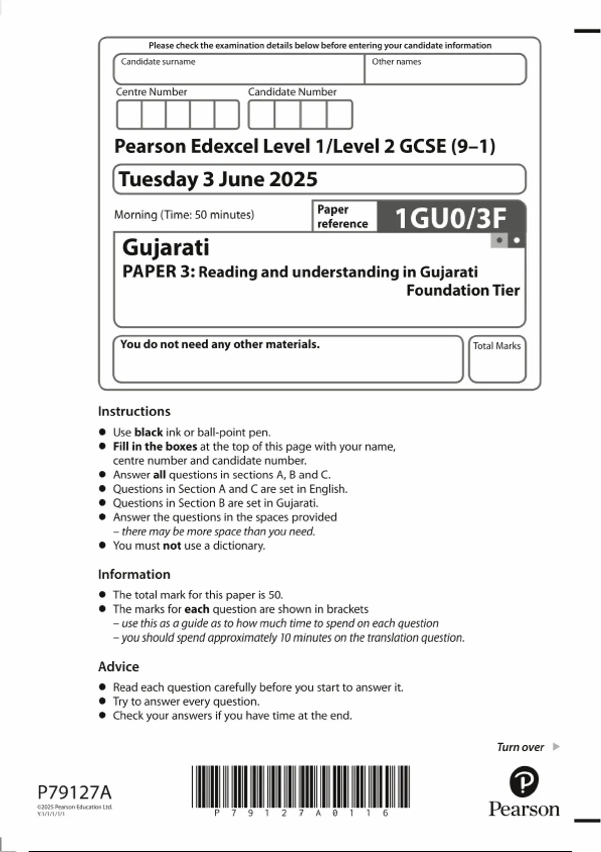 2025 Pearson Edexcel GCSE Gujarati PAPER 3 1GU0/3F