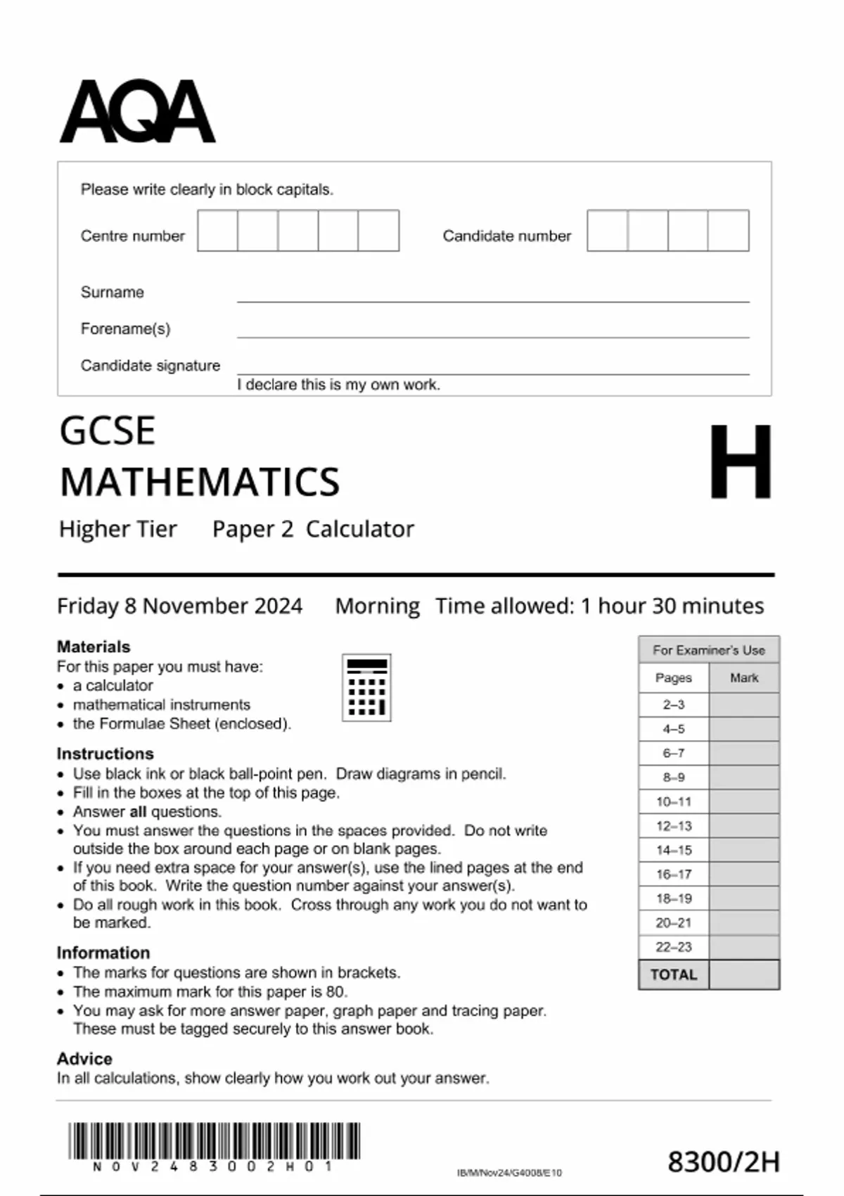 2025 AQA GCSE MATHEMATICS Higher Tier PAPER 2 8300/2H :Calculator