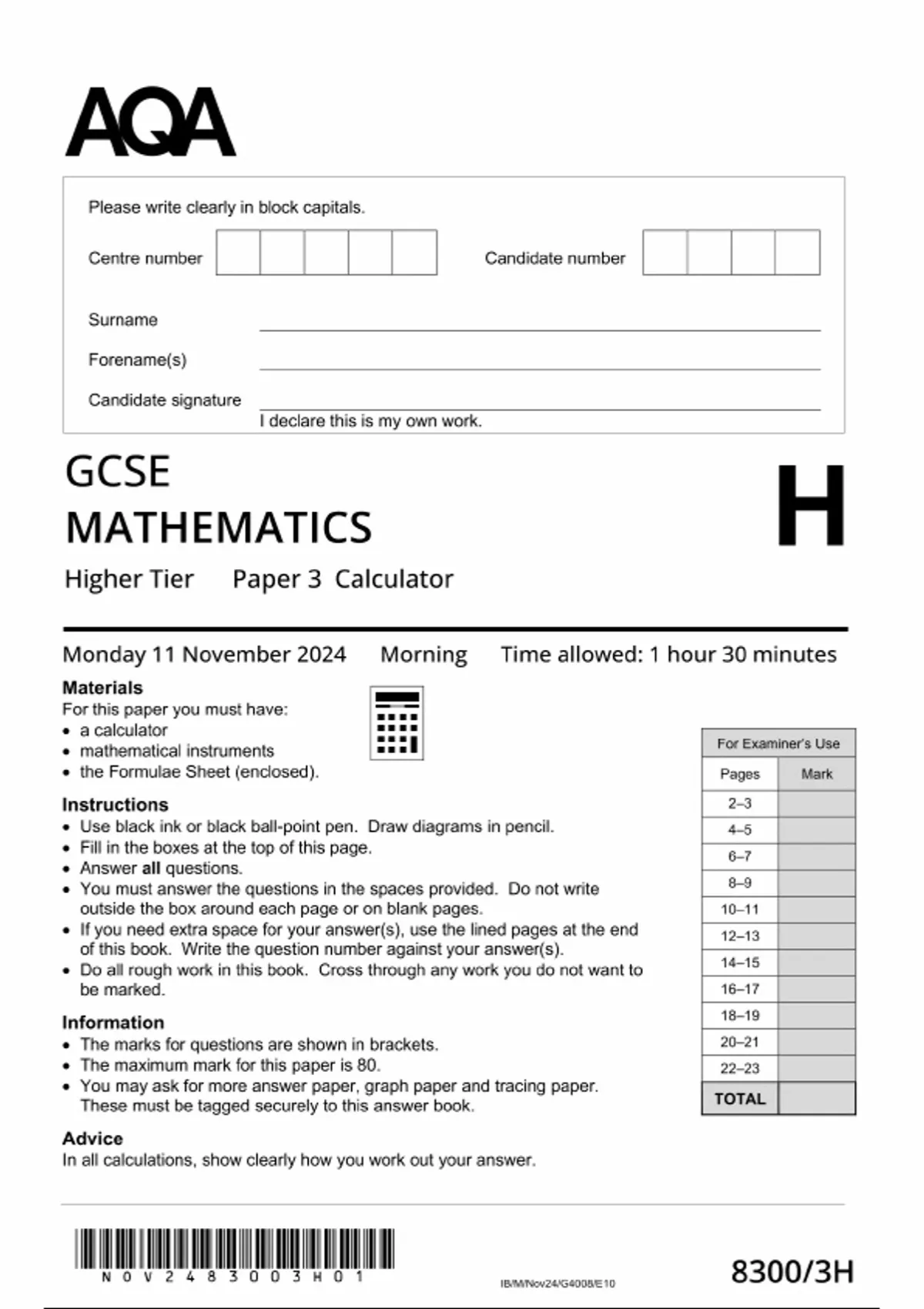 2025 AQA GCSE MATHEMATICS Higher Tier PAPER 3 8300