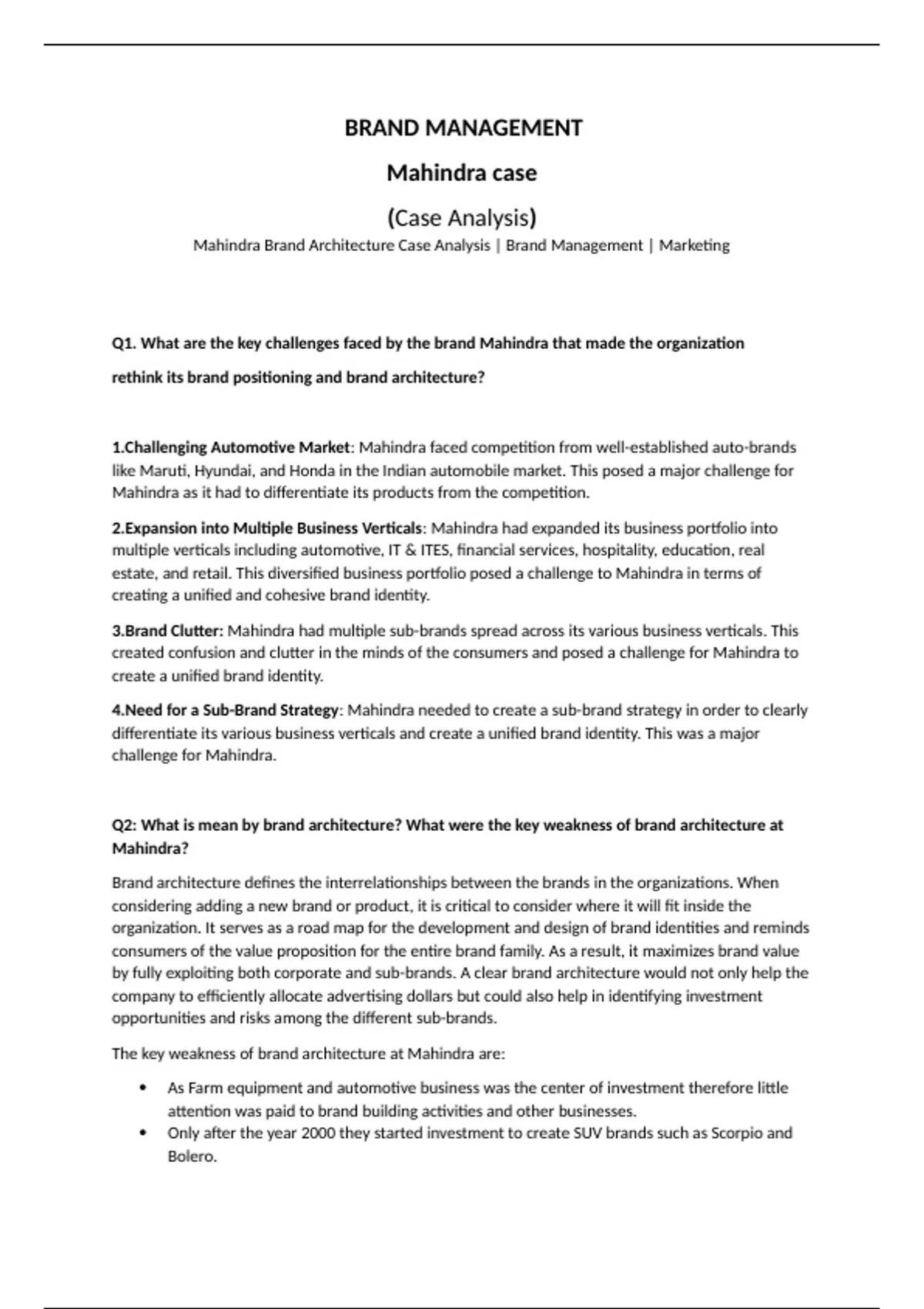 This case assignment focuses on Brand Management, analysing how Mahindra has built, positioned, and managed its brand in a competitive market. The case applies branding concepts such as brand identity, brand positioning, brand architecture, and competitive strategy to a real-world Indian business context. It is relevant for MBA and postgraduate marketing courses where case-based analysis is required.