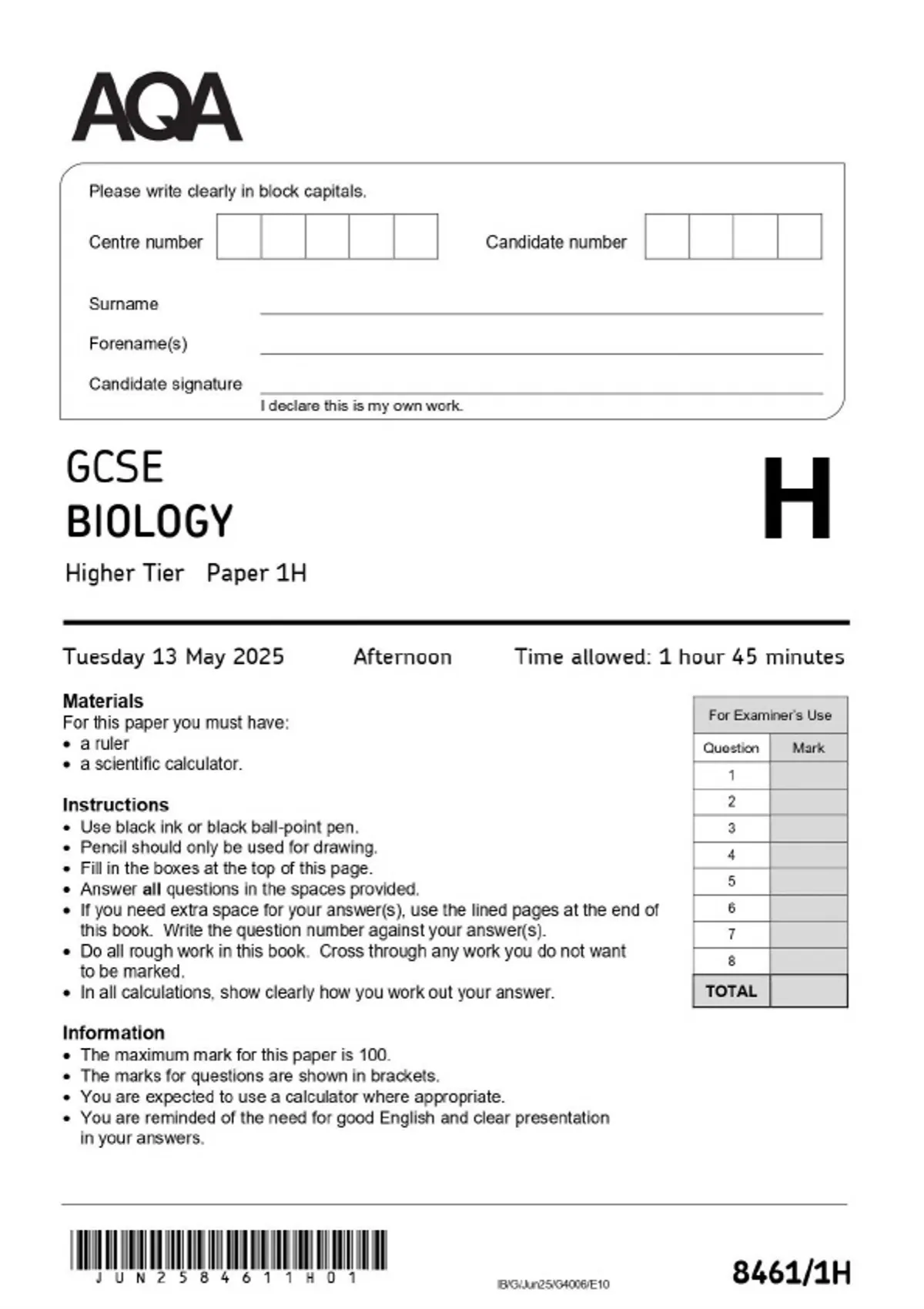 AQA GCSE BIOLOGY Higher Tier Paper 1H MAY 2025 Combined Question Paper and Mark Scheme