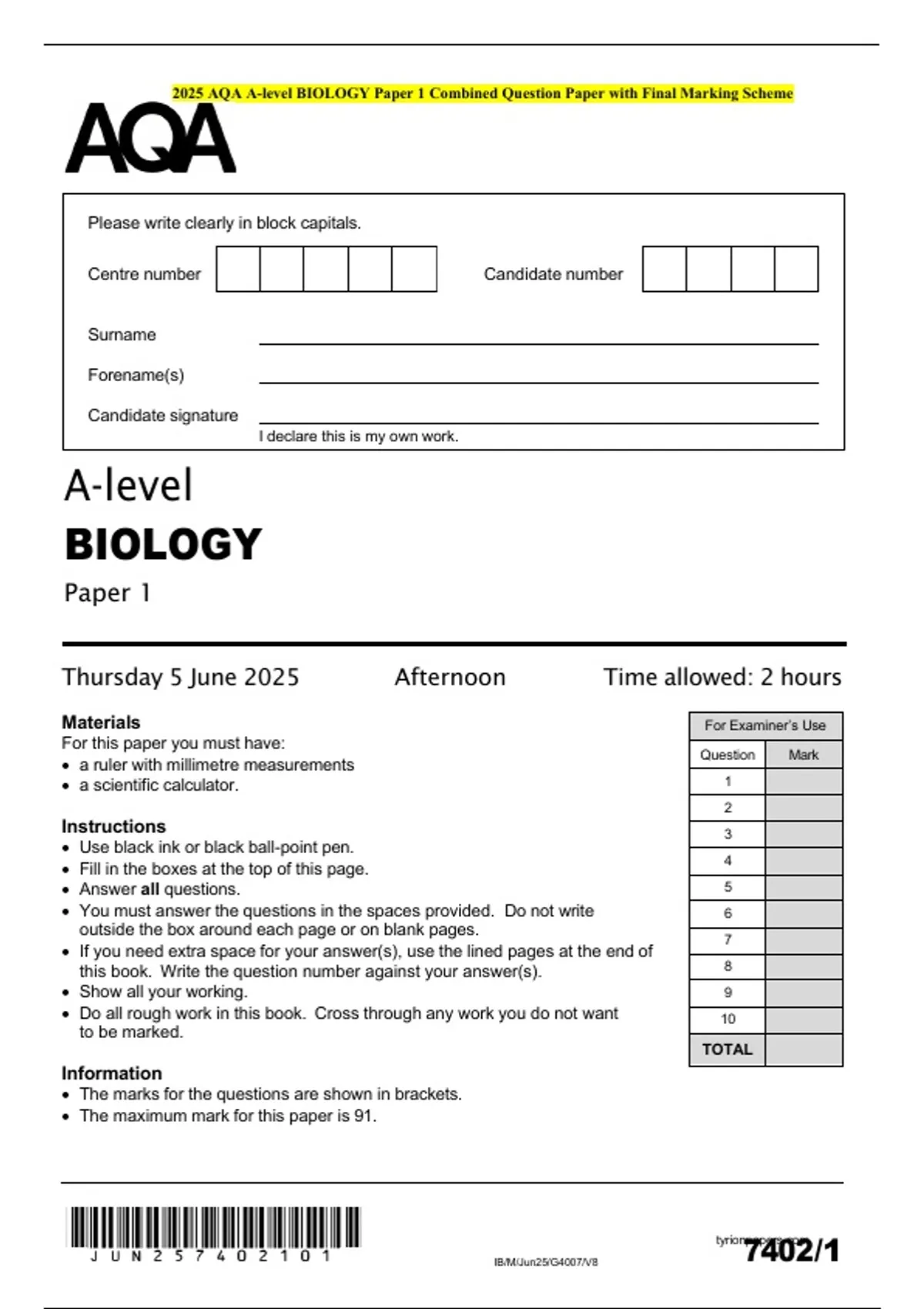 2025 AQA A-level BIOLOGY Paper 1 Combined Question Paper with Final Marking Scheme