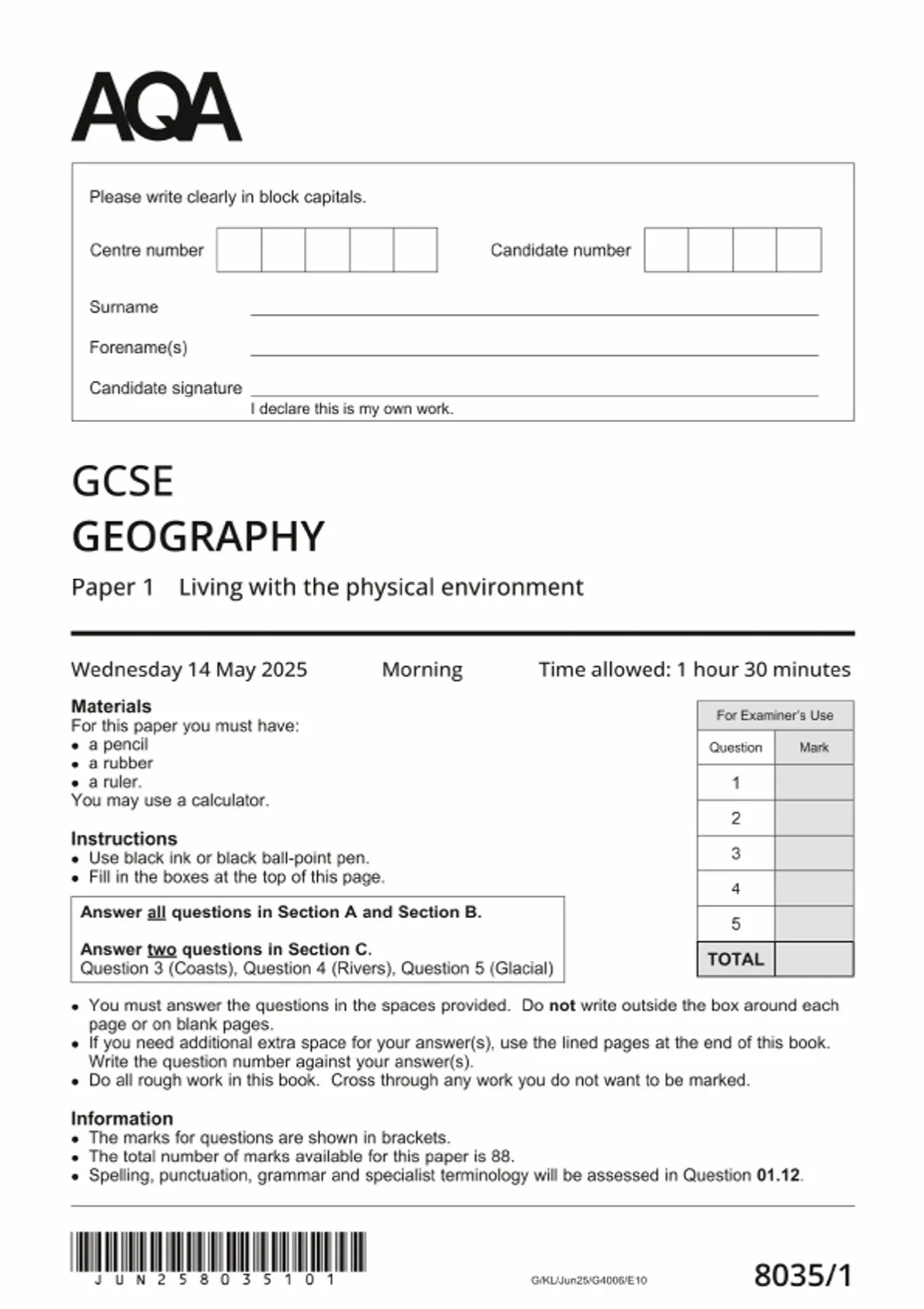2025 AQA GCSE GEOGRAPHY Paper 1 QUESTION PAPER 18035/1 :Living with the physical environment