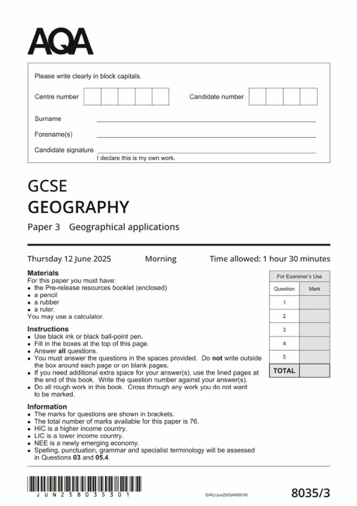 2025 AQA GCSE GEOGRAPHY Paper 3 QUESTION PAPER 18035/3 : Geographical applications