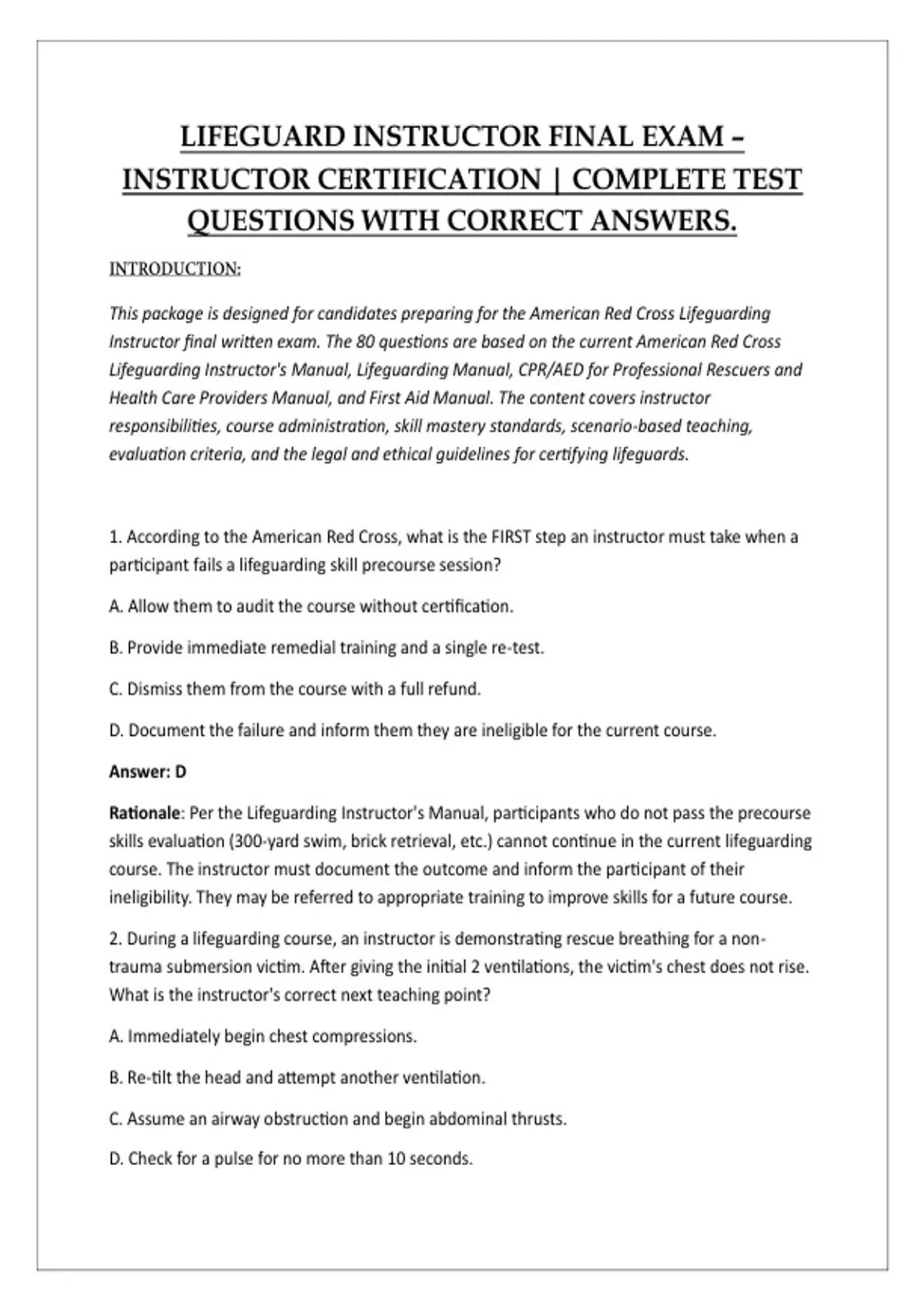 This document contains a complete set of Lifeguard Instructor final exam questions with accurate, correct answers for certification preparation and review. It covers instructional techniques, course administration, safety supervision, rescue skills evaluation, emergency action plans, legal responsibilities, and standards required for lifeguard instructor certification.