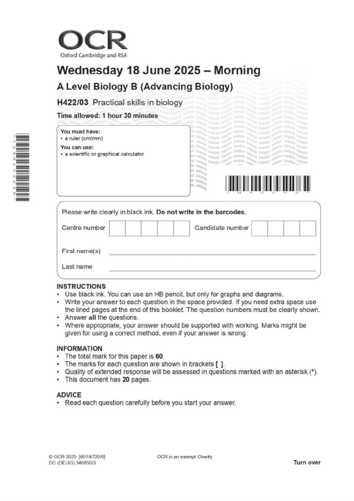 OCR A Level Biology B (Advancing Biology) H422/03 Practical skills in biology JUNE 2025 Combined Question Paper and Mark Scheme