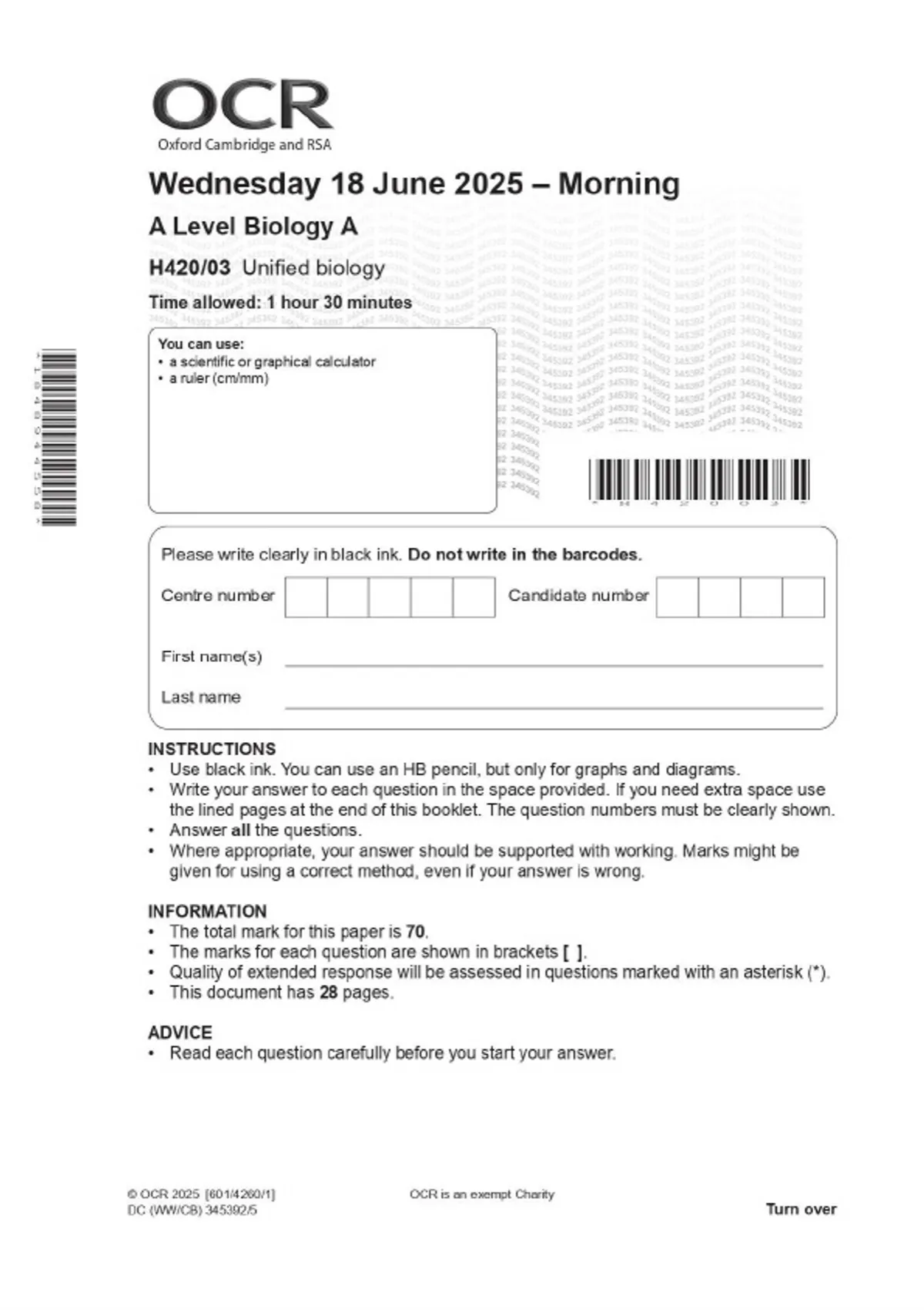 OCR A Level Biology A H420/03 Unified biology JUNE 2025 Combined Question Paper and Mark Scheme