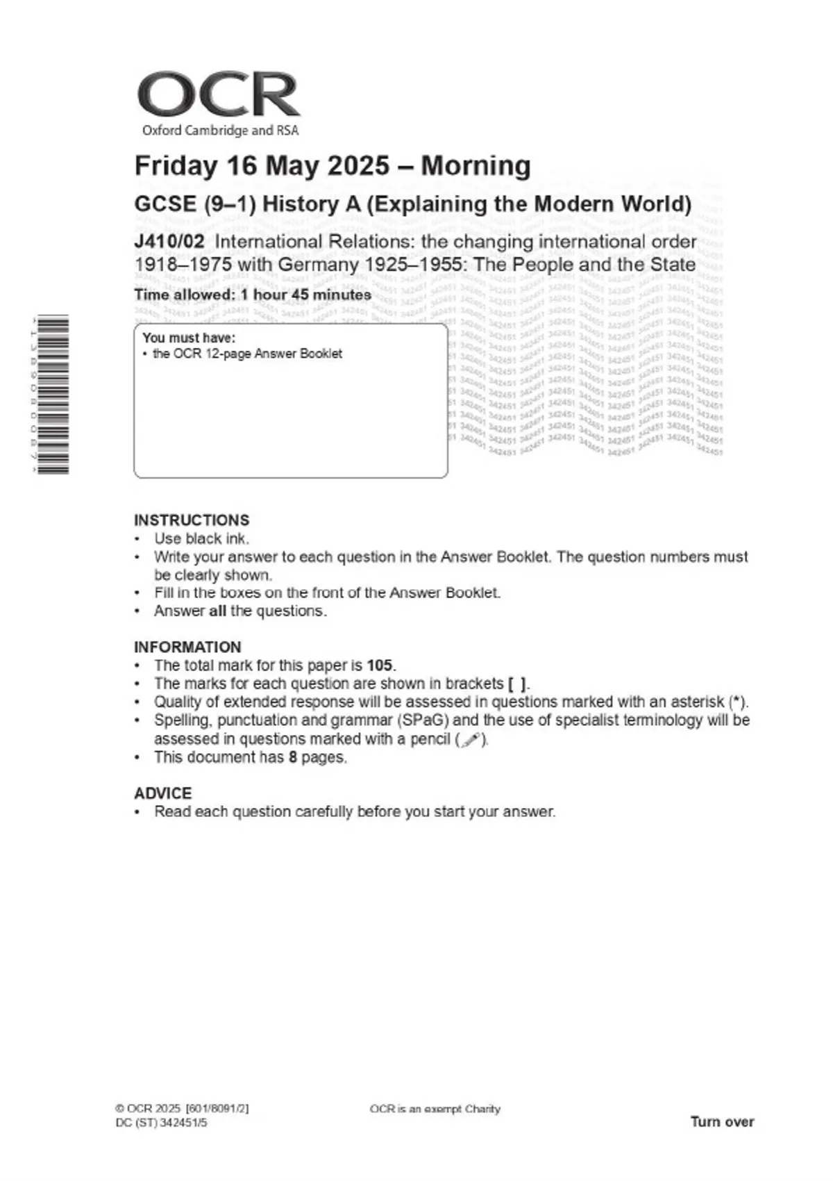 OCR GCSE (9–1) History A (Explaining the Modern World) J410/02 International Relations: the changing international order 1918–1975 with Germany 1925–1955: The People and the State MAY 2025 Combined Question Paper and Mark Scheme