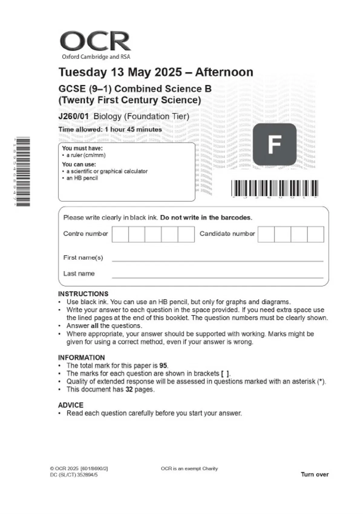 OCR GCSE (9–1) Combined Science B (Twenty First Century Science) J260/01 Biology (Foundation Tier) MAY 2025 Combined Question Paper and Mark Scheme
