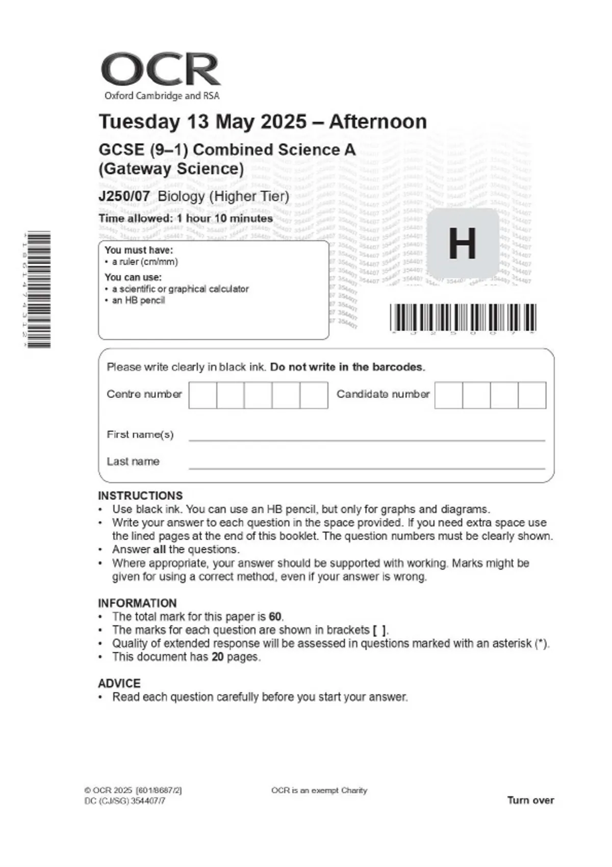 OCR GCSE (9–1) Combined Science A (Gateway Science) J250/07 Biology (Higher Tier) MAY 2025 Combined Question Paper and Mark Scheme