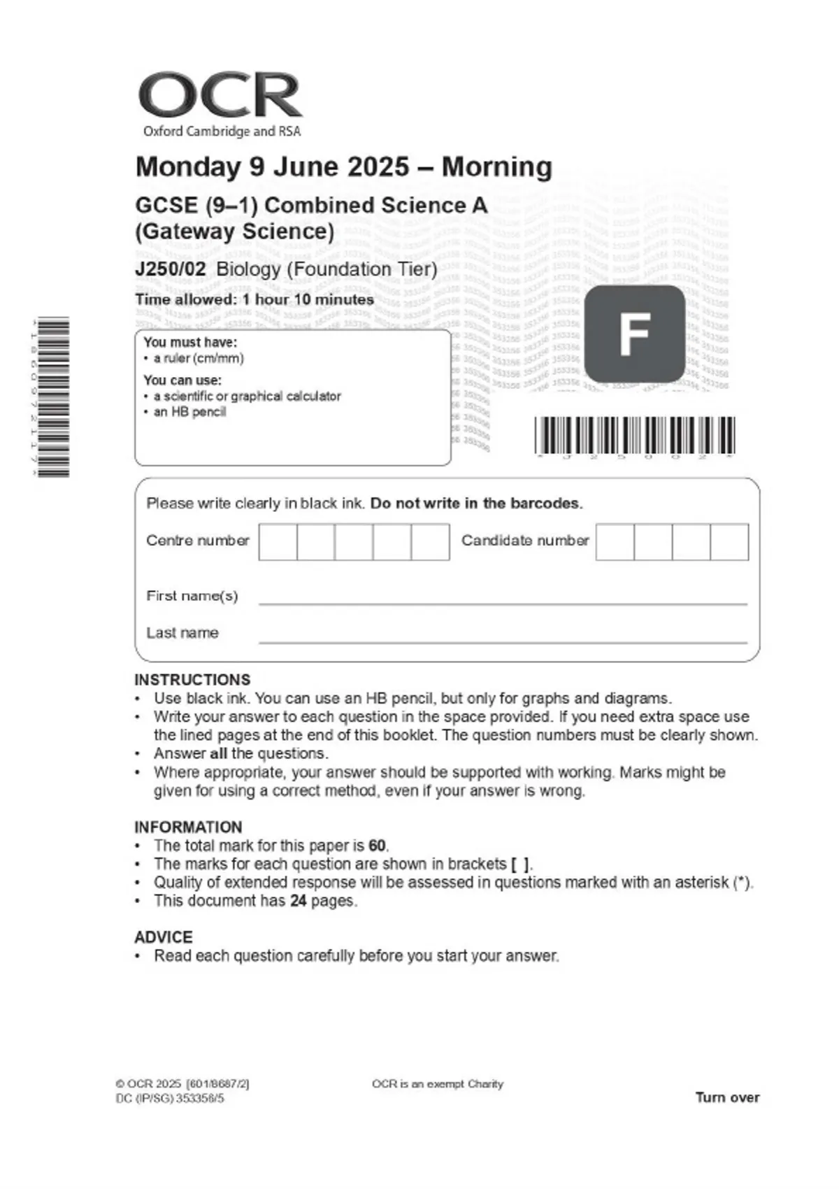 OCR GCSE (9–1) Combined Science A (Gateway Science) J250/02 Biology (Foundation Tier) MAY 2025 Combined Question Paper and Mark Scheme