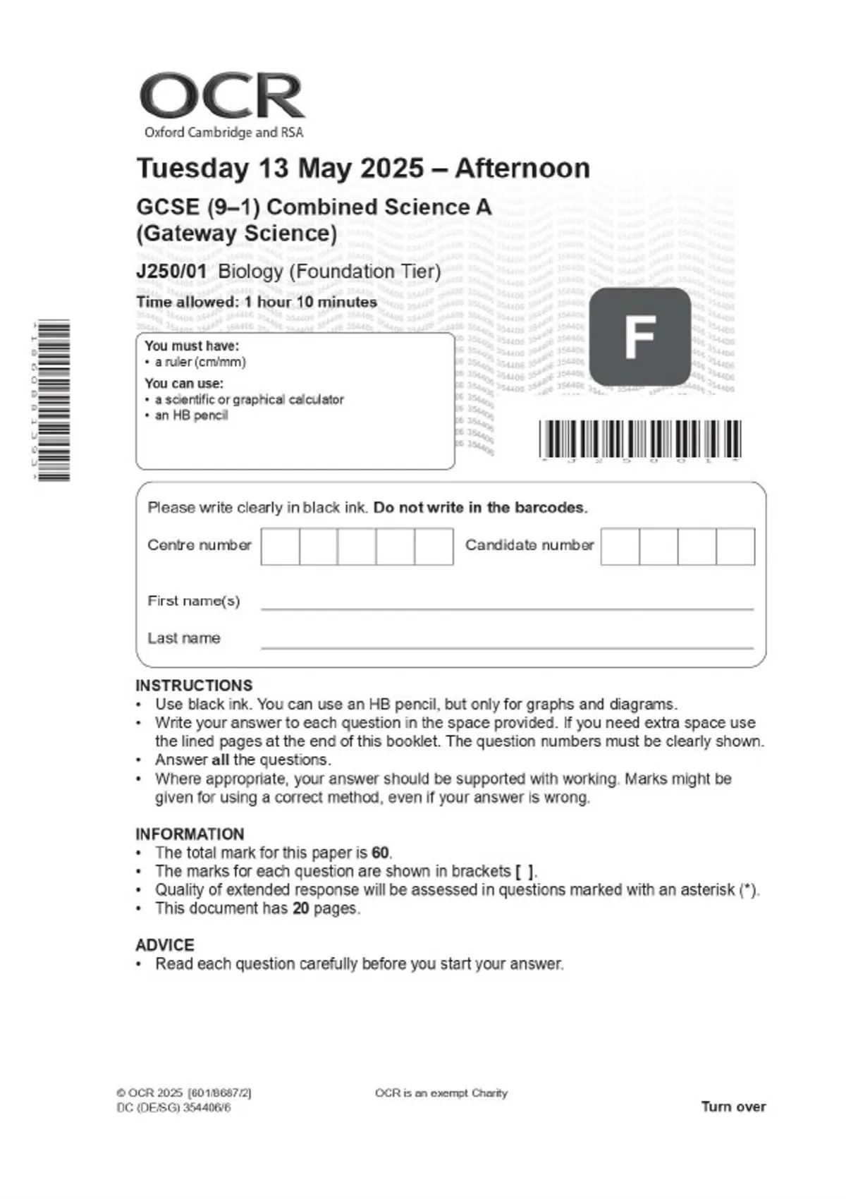 OCR GCSE (9–1) Combined Science A (Gateway Science) J250/01 Biology (Foundation Tier) MAY 2025 Combined Question Paper and Mark Scheme