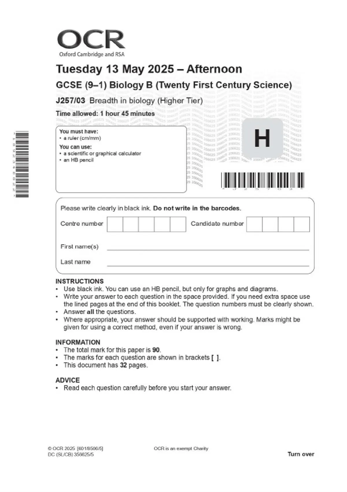 OCR GCSE (9–1) Biology B (Twenty First Century Science) J257/03 Breadth in biology (Higher Tier) MAY 2025 Combined Question Paper and Mark Scheme