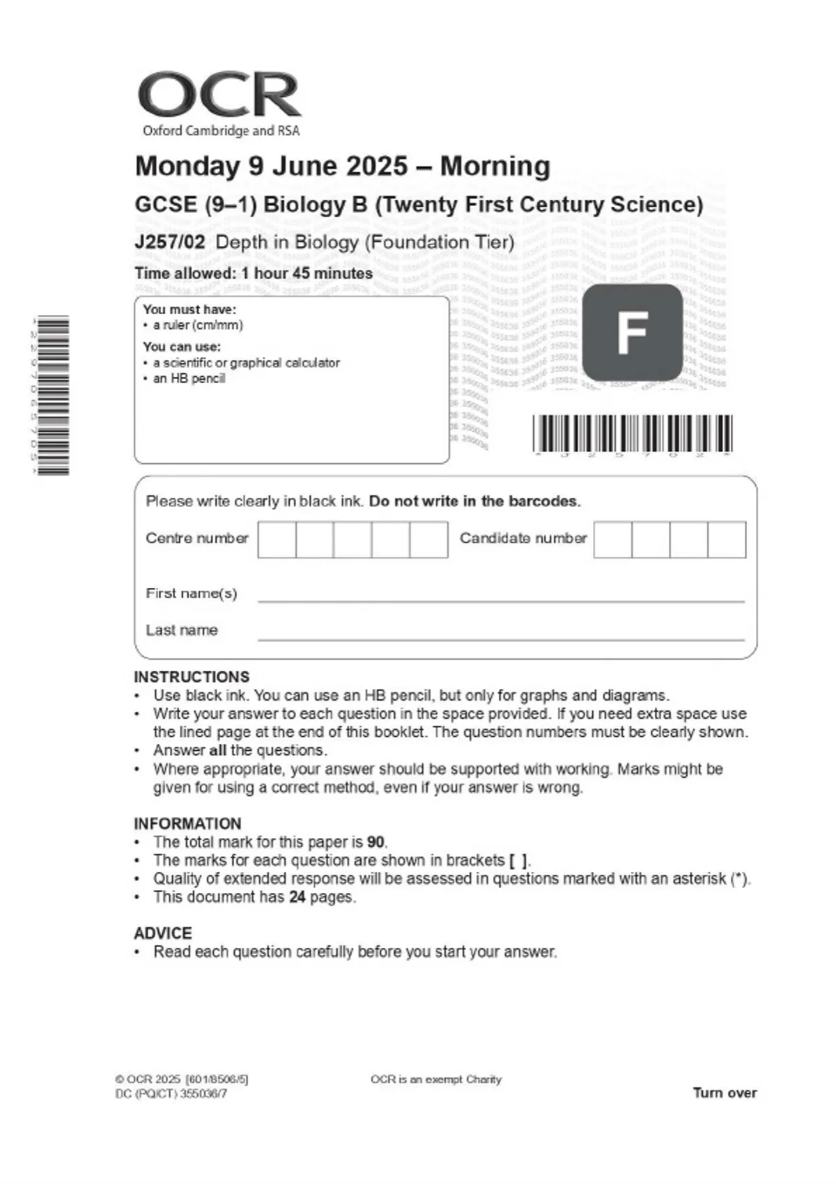 OCR GCSE (9–1) Biology B (Twenty First Century Science) J257/02 Depth in Biology (Foundation Tier) JUNE 2025 Combined Question Paper and Mark Scheme