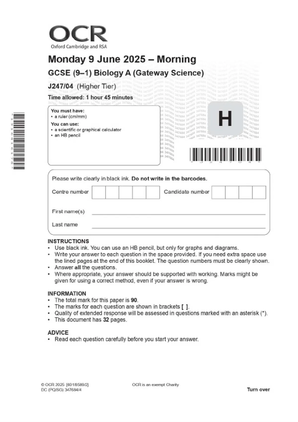 OCR GCSE (9–1) Biology A (Gateway Science) J247/04 (Higher Tier) JUNE 2025 Combined Question Paper and Mark Scheme