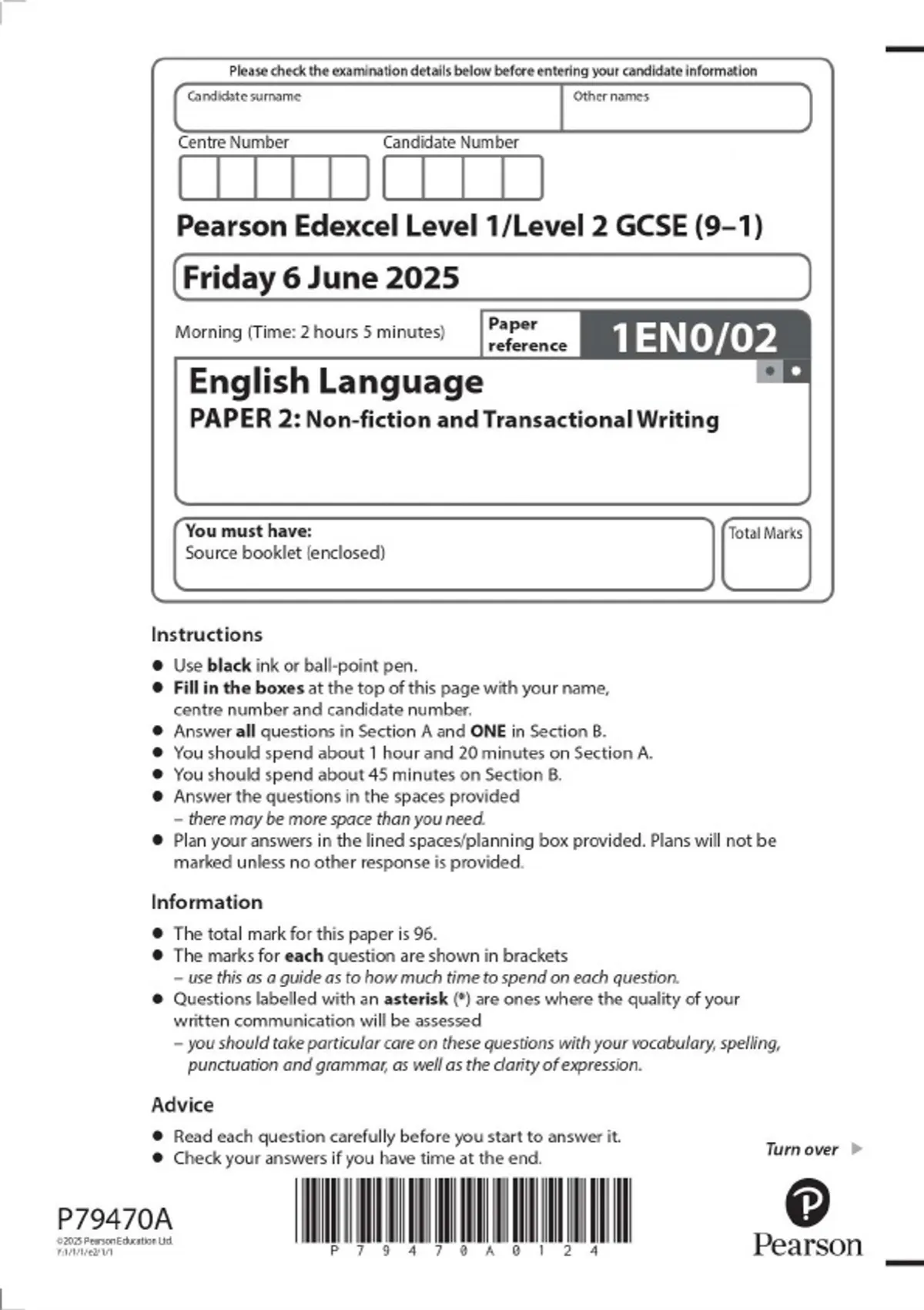 Pearson Edexcel Level1/Level 2 GCSE (9–1) English Language PAPER 2: Non fiction and Transactional Writing JUNE 2025 Combined Question Paper and Mark Scheme