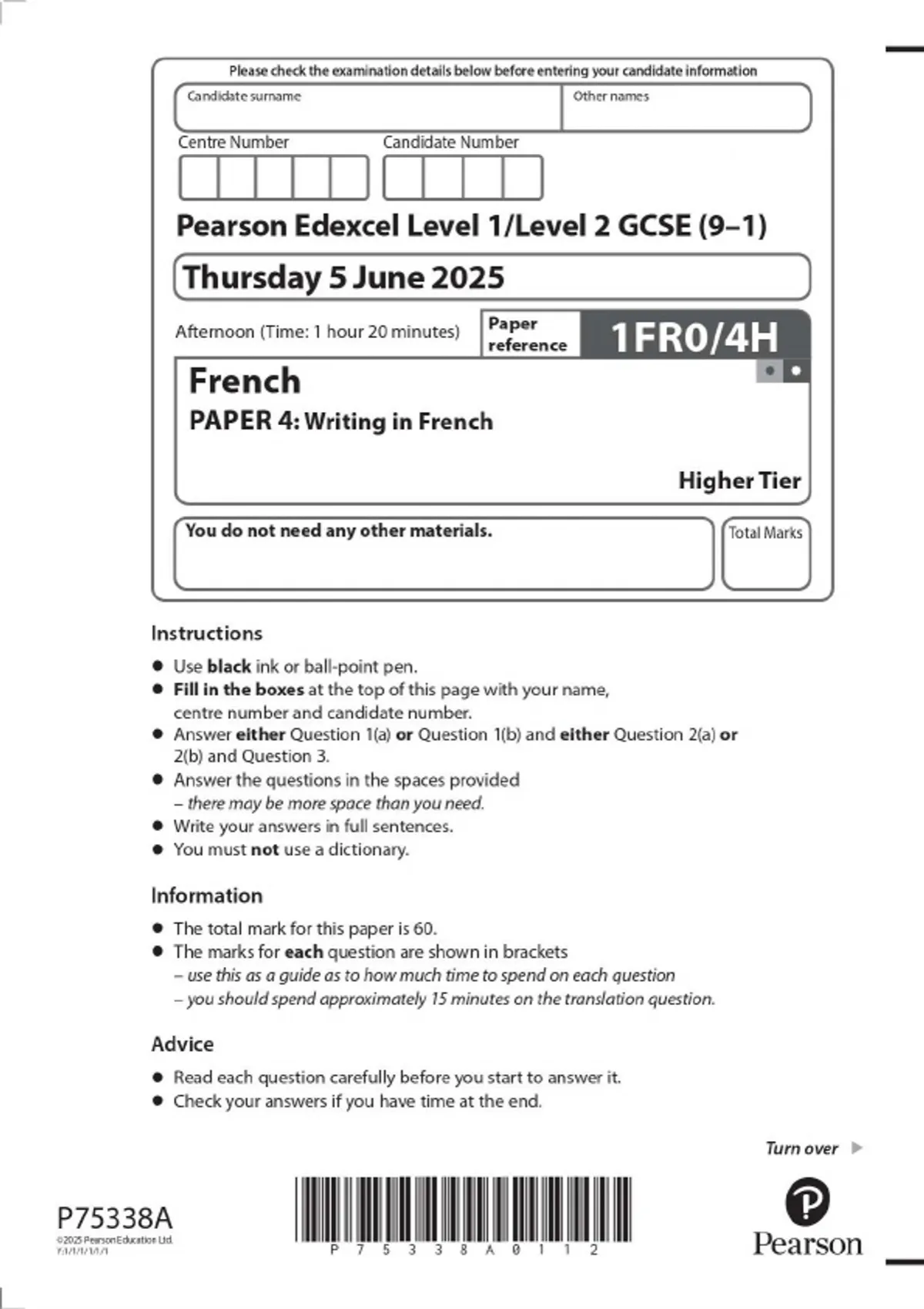 Pearson Edexcel Level 1/Level 2 GCSE (9–1) French PAPER 4: Writing in French Higher Tier JUNE 2025 Combined Question Paper and Mark Scheme