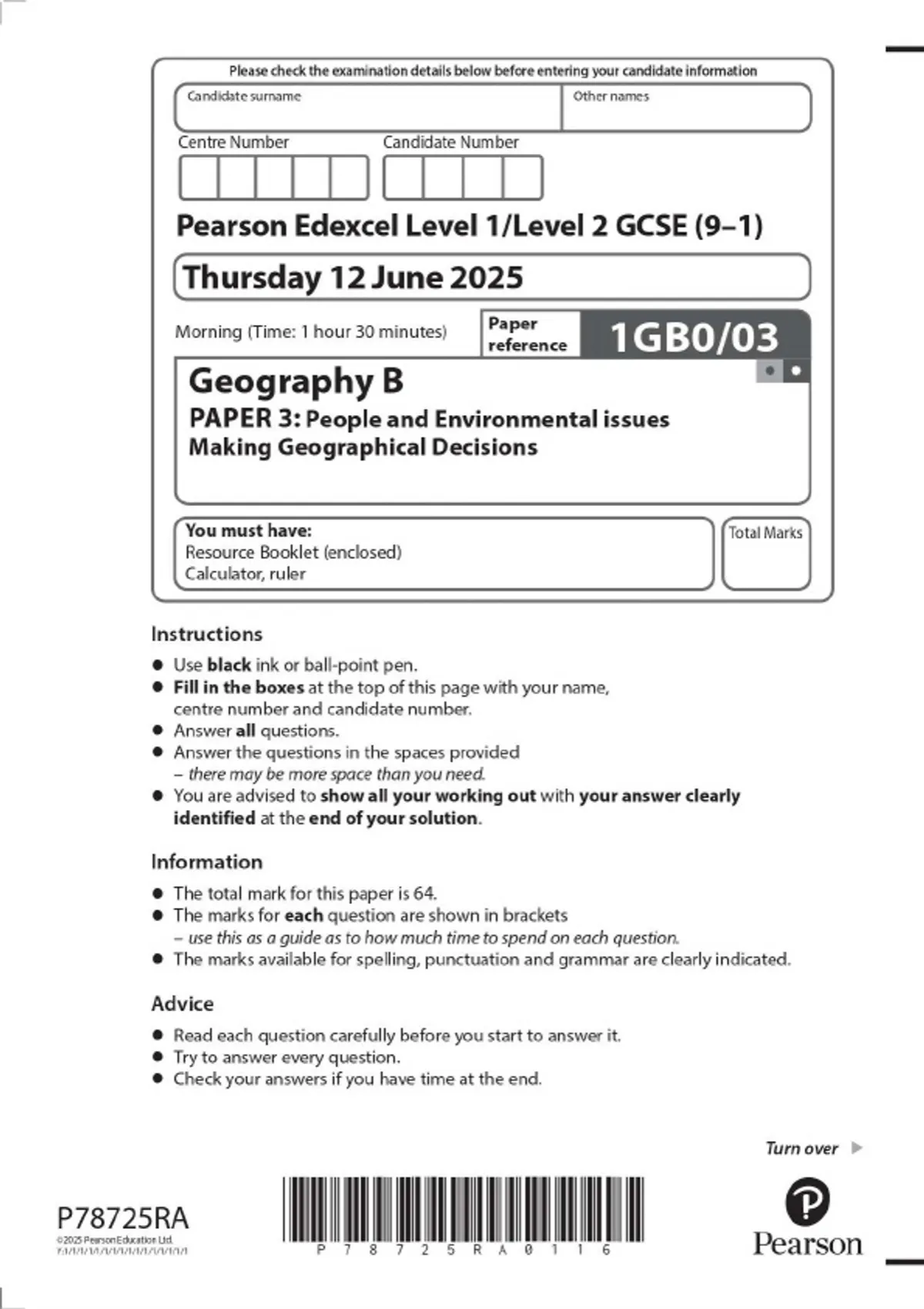Pearson Edexcel Level1/Level 2 GCSE (9–1) Geography B PAPER 3: People and Environmental issues Making Geographical Decisions JUNE 2025 Combined Question Paper and Mark Scheme