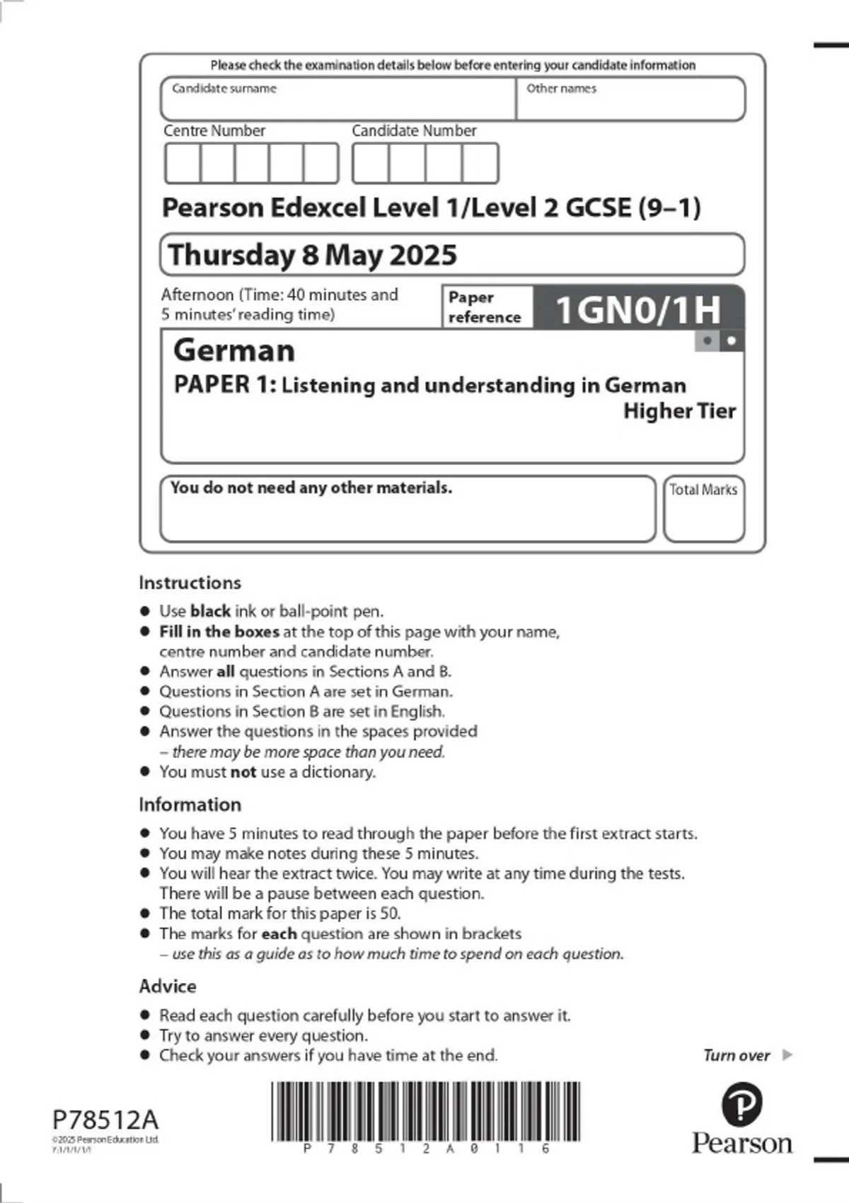 Pearson Edexcel Level1/Level 2 GCSE (9–1) German PAPER 1: Listening and understanding in German Higher Tier MAY 2025 Combined Question Paper and Mark Scheme