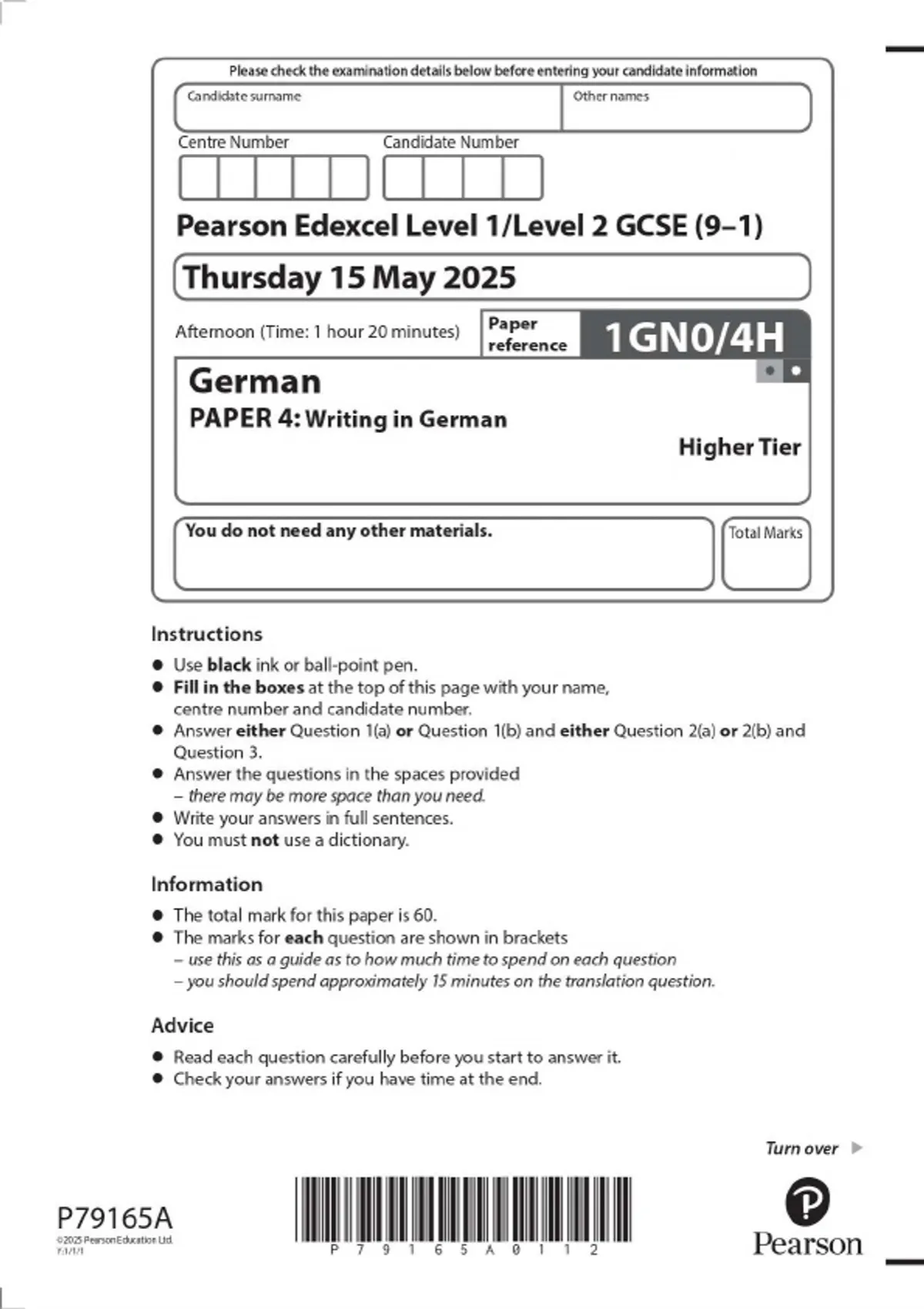 Pearson Edexcel Level1/Level 2 GCSE (9–1) German PAPER 4: Writing in German Higher Tier MAY 2025 Combined Question Paper and Mark Scheme