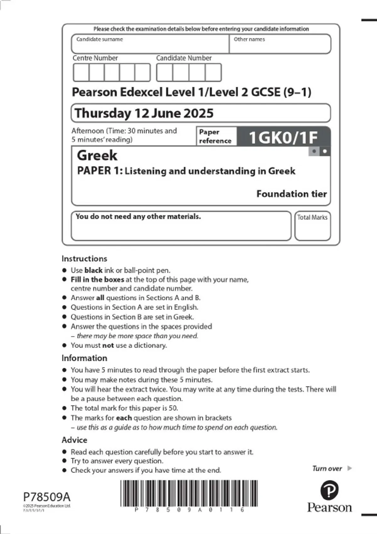 Pearson Edexcel Level 1/Level 2 GCSE (9–1) Greek PAPER 1: Listening and understanding in Greek Foundation tier JUNE 2025 Combined Question Paper and Mark Scheme