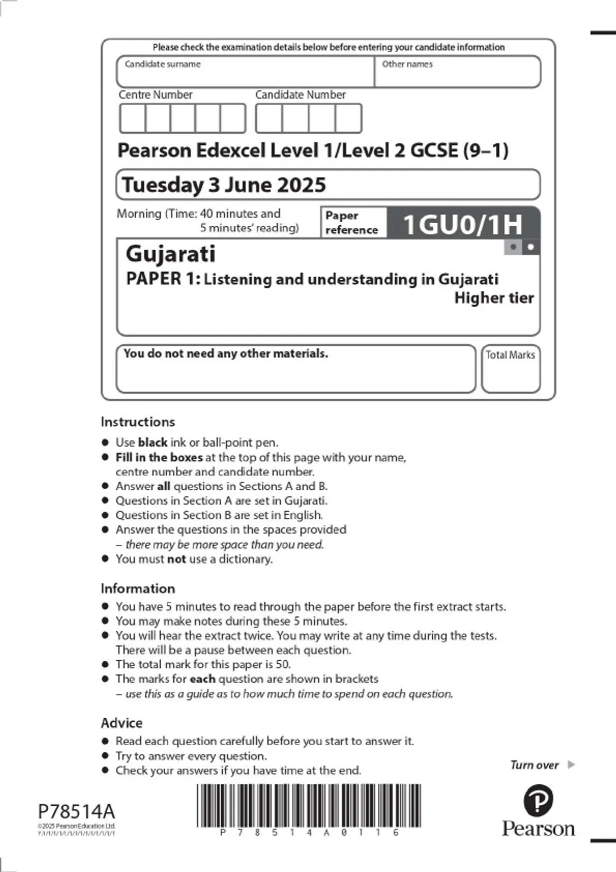 Pearson Edexcel Level 1/Level 2 GCSE (9–1) Gujarati PAPER 1: Listening and understanding in Gujarati Higher tier JUNE 2025 Combined Question Paper and Mark Scheme