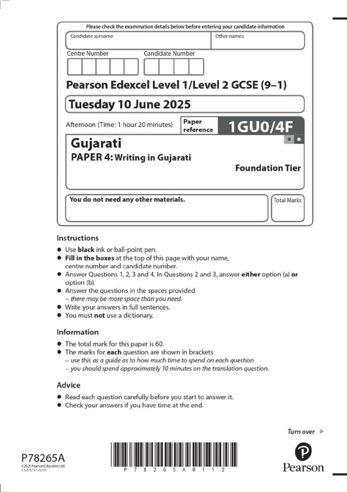 Pearson Edexcel Level 1/Level 2 GCSE (9–1) Gujarati PAPER 4: Writing in Gujarati Foundation Tier JUNE 2025 Combined Question Paper and Mark Scheme