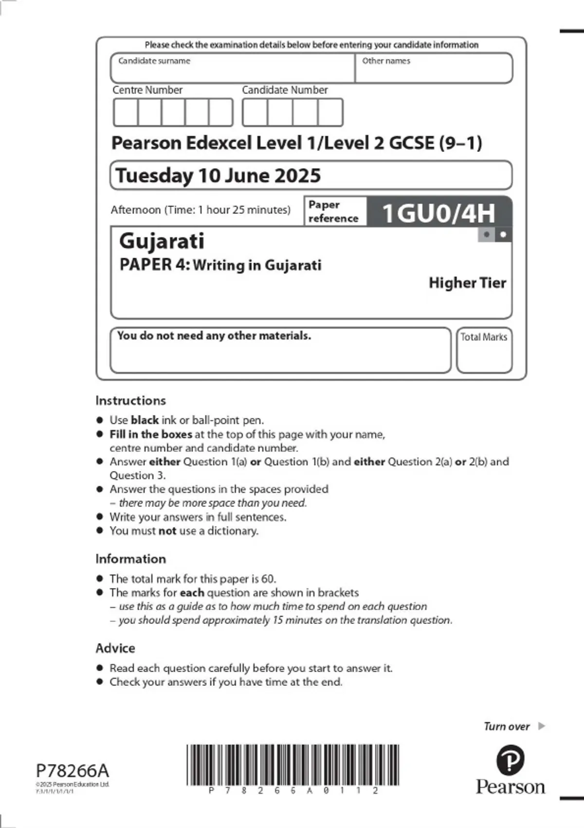Pearson Edexcel Level 1/Level 2 GCSE (9–1) Gujarati PAPER 4: Writing in Gujarati Higher Tier JUNE 2025 Combined Question Paper and Mark Scheme