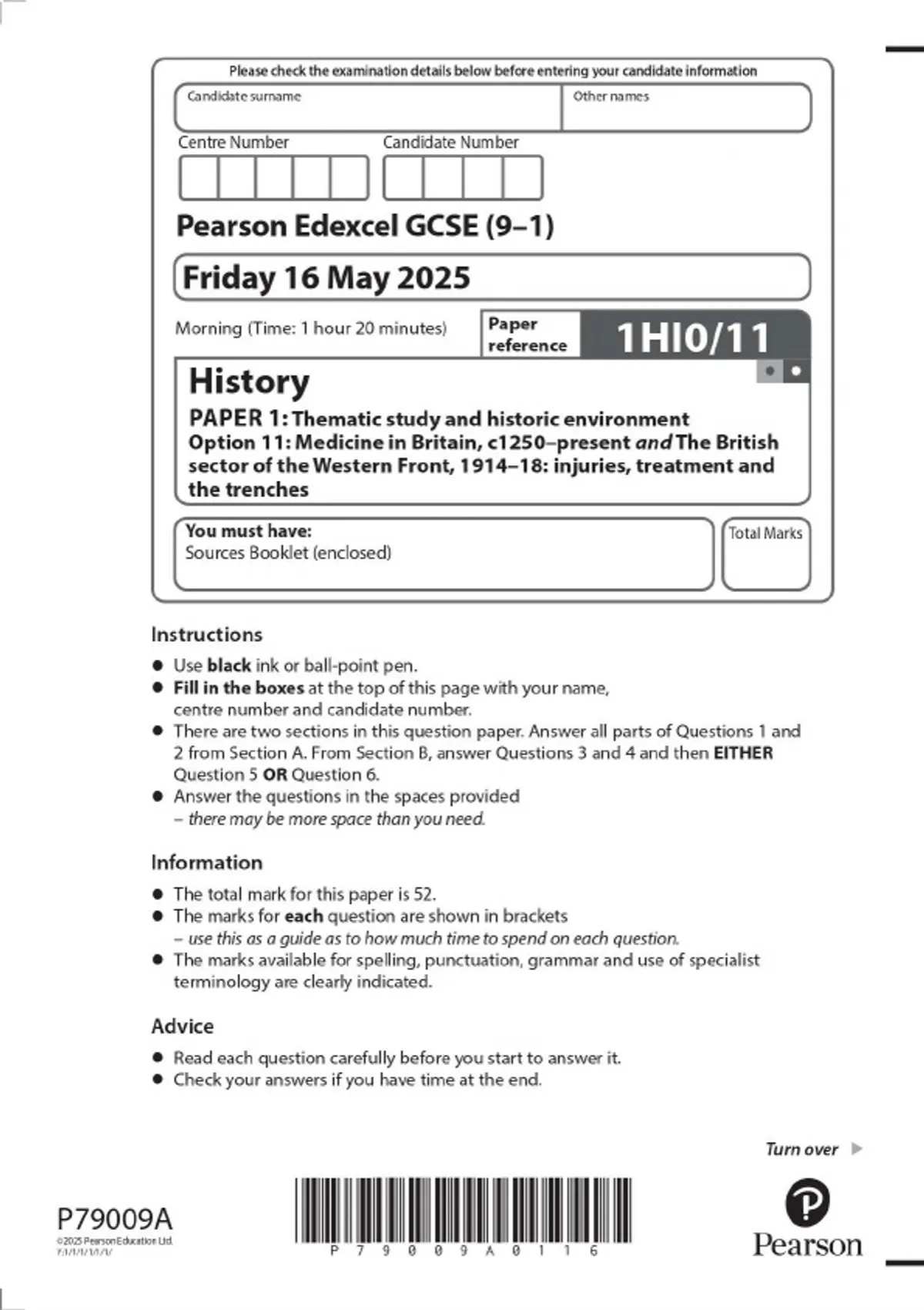 Pearson Edexcel GCSE (9–1) History PAPER 1: Thematic study and historic environment Option 11: Medicine in Britain, c1250–present and The British sector of the Western Front, 1914–18: injuries, treatment and the trenches MAY 2025 Combined Question Paper