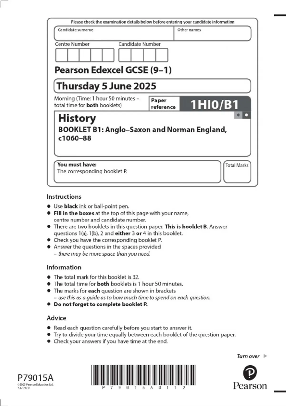 Pearson Edexcel GCSE (9–1) History BOOKLET B1: Anglo–Saxon and Norman England, c1060–88 JUNE 2025 Combined Question Paper and Mark Scheme