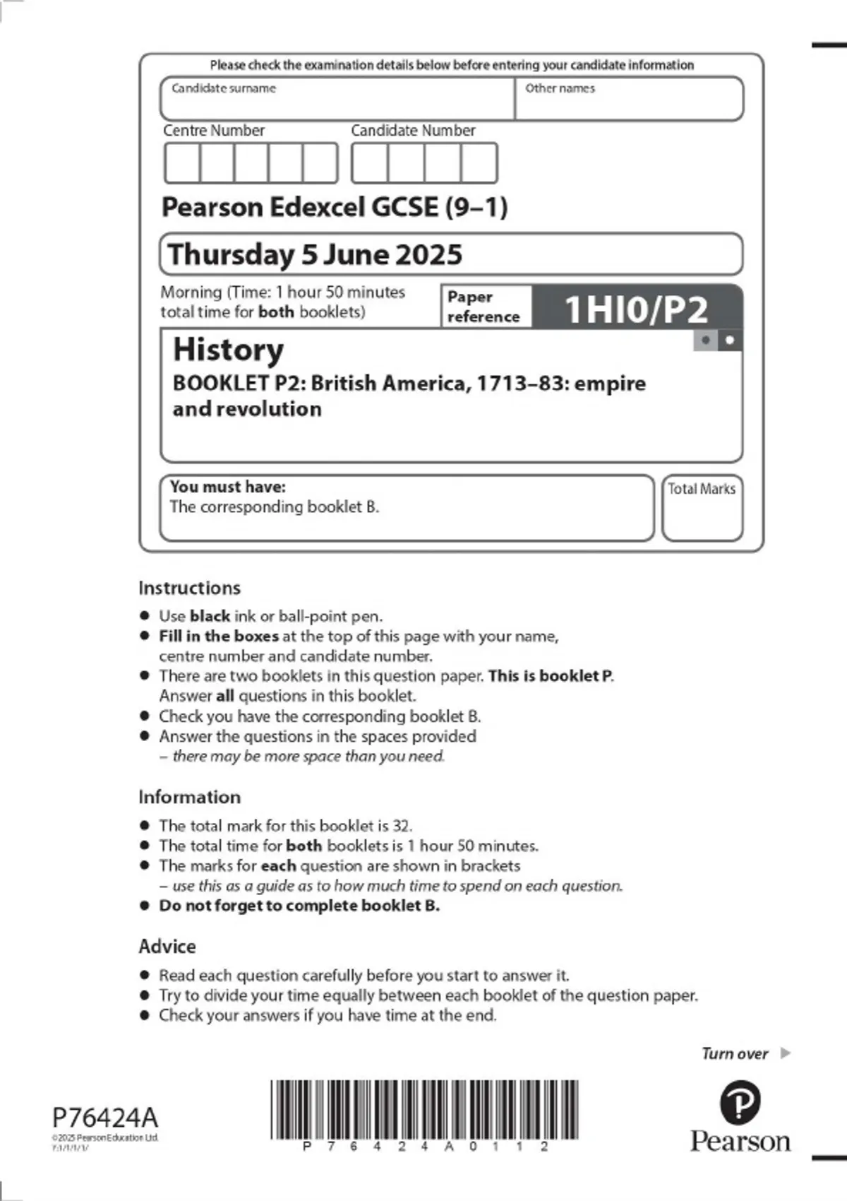 Pearson Edexcel GCSE (9–1) History BOOKLET P2: British America, 1713–83: empire and revolution JUNE 2025 Combined Question Paper and Mark Scheme