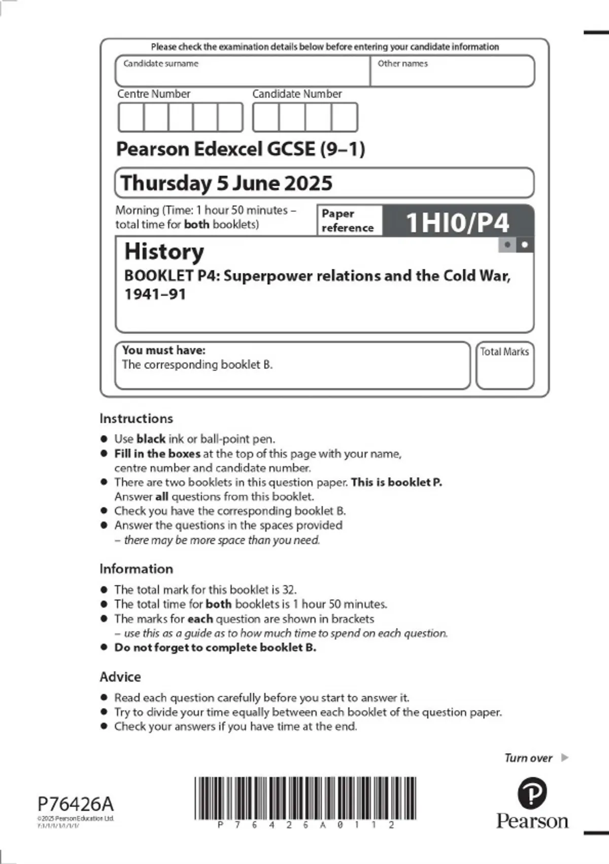 Pearson Edexcel GCSE (9–1) History BOOKLET P4: Superpower relations and the Cold War, 1941–91 JUNE 2025 Combined Question Paper and Mark Scheme