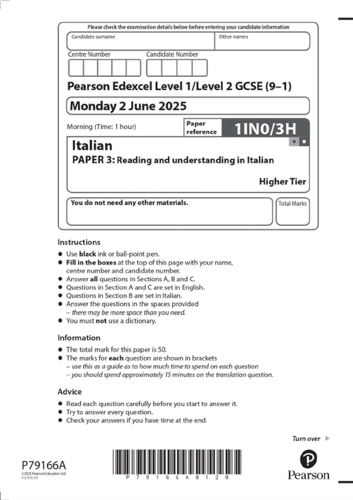 Pearson Edexcel Level 1/Level 2 GCSE (9–1) Italian PAPER 3: Reading and understanding in Italian Higher Tier JUNE 2025 Combined Question Paper and Mark Scheme
